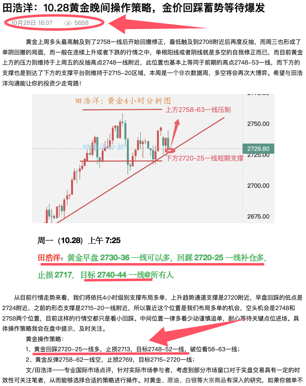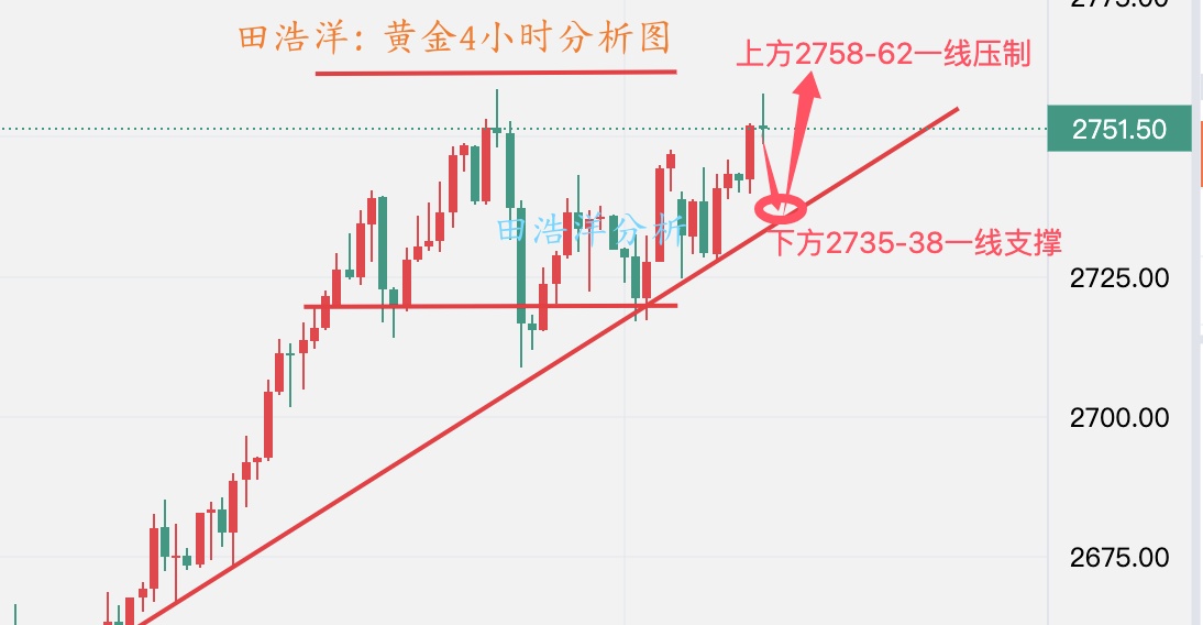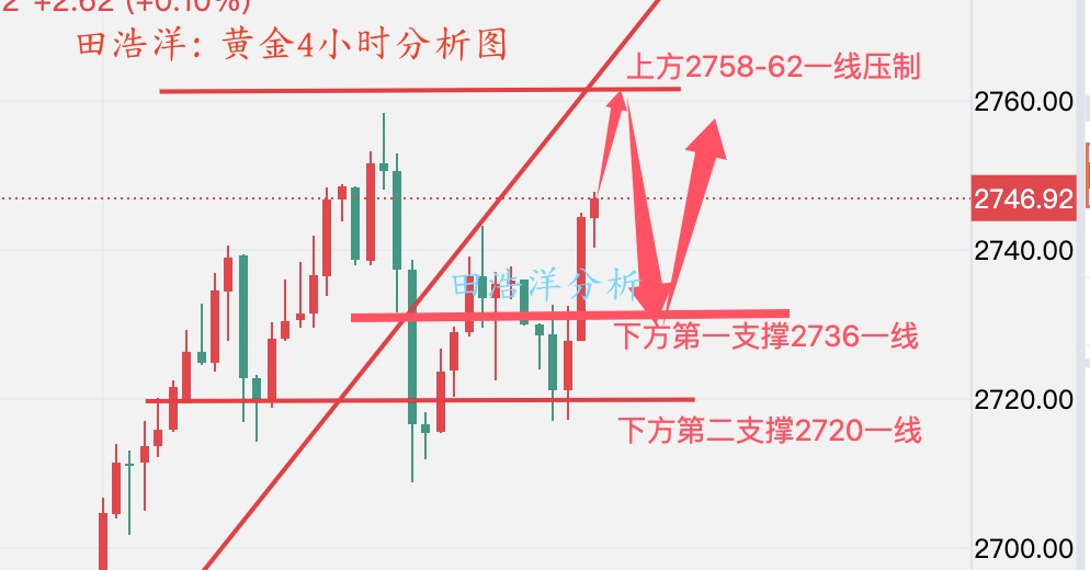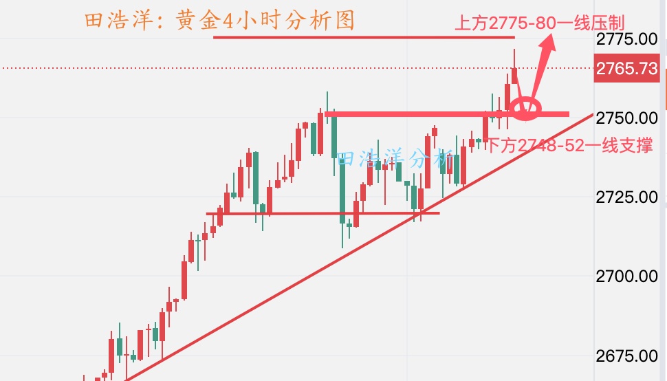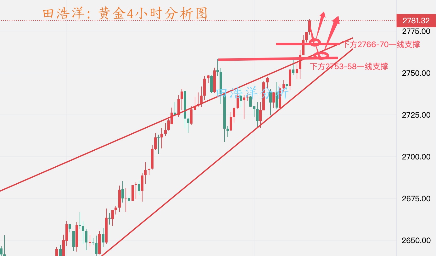 黄金周三白天就给了就操作思路,早盘给了回踩2766-70一线做多,因为趋势回踩是多头,上午实盘给了反弹2780-85一线空,晚上给了2770一线多,相信经常关注我文章的朋友可以看得到,毕竟操作上依旧以顺势回踩做多为主,但是不要追单,等行情稳定找机会进场,本周是一个非农数据周,行情波动会比较大。希望与田浩洋沟通能让你的投资少走弯路! 从目前行情走势来看,我们将依托4小时级别支撑布局多单,下方支撑是2766-70一线附近,重点关注2753-58一线支撑,回踩我们找机会布局多单,中间位置一律多看少动谨慎追单,耐心等待关键点位进场。具体操作策略我会在盘中提示,及时关注。 黄金操作策略: 1、黄金回踩