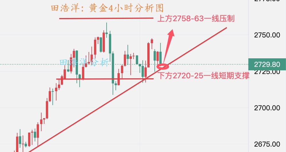 黄金上周多头最高触及到了2758一线后开始回撤修正,最低触及到2708附近后再度反抽,而周三也形成了单阴回撤的局面,而一般在连续上升或者下跌的行情之中,单根阳线或者阴线就是多空的自我修正而已,而目前黄金上方的压力则维持于上周五的反抽高点2748一线附近,此位置也基本上等同于前期的高点2748-53一线,而下方的支撑也是到达了下方的支撑平台则维持于2715-20区域,本周是一个非农数据周,多空将会再次大博弈。希望与田浩洋沟通能让你的投资少走弯路! 从目前行情走势来看,我们将依托4小时级别支撑布局多单,上升趋势通道支撑是2720附近,早盘回踩的低点是2724附近,之前的形态支撑是2715-20一