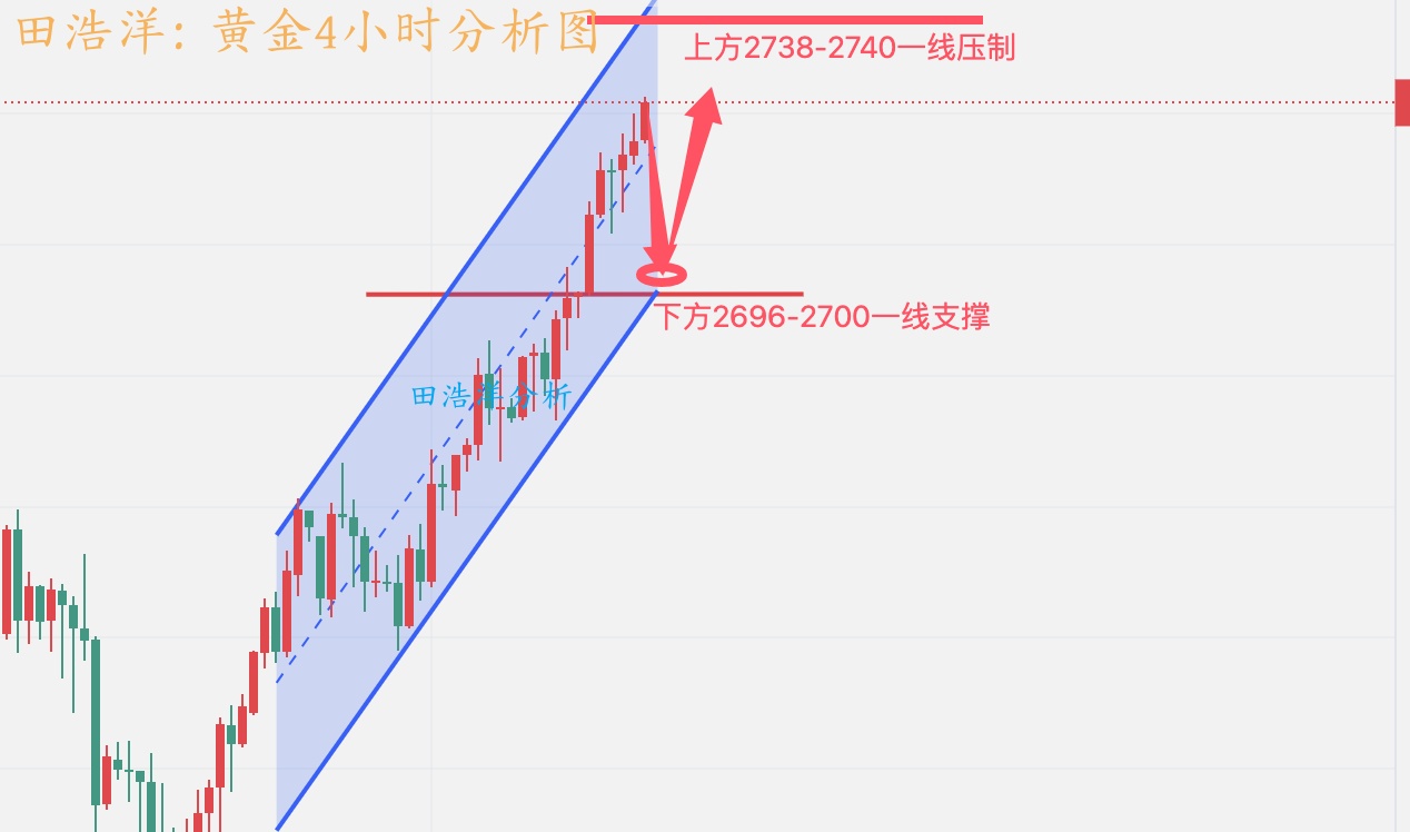本周黄金如上周末分析一致,一致不停做多,以做多为顺势之道,才能获取更大的利润,黄金近期强势根本停不下来,金价走势突破2700关口,并且突破之后是呈现加速上涨的状态,我们依旧是在原来的趋势基础上以看多为主!黄金多头势不可挡,黄金根本没有过大的回调,铆足劲往上涨,黄金小时线就是不停的上涨,黄金突破2696之后加速上涨,说明2696短线支撑有效,黄金回踩就继续多,希望与田浩洋沟通能让你的投资少走弯路! 从目前行情走势来看,下周下方关注2696-2700一线支撑,上方依旧关注2738-2740一线压制,黄金仍然是处于多头的排列,日线也形成了多头的排列,均线系统也较完美,我们本轮的目标将是2738-4