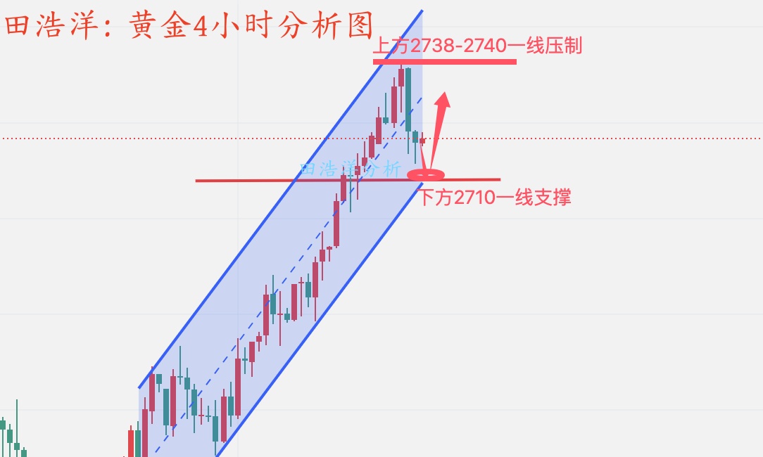黄金昨天周一开盘就2720一线开始上涨,最高也是上冲到我们周末给的2738-2740一线阻力位,然后也是从2738-2740一线完美回落,如期让我们在上涨过程中做了多,然后在2738-40一线也顺势做了空,因为周末我们就给了这样的高点,所以在此做空必然是势在必得,空单也是2720-25一线完美获利出局,相信关注我文章的朋友都能看得到,今天我们回踩继续多,做多依旧是趋势,昨晚的回撤并没有改变方向,希望与田浩洋沟通能让你的投资少走弯路! 从目前早盘开盘4小时走势来看,黄金多头依旧存在,下方我们关注2710一线支撑,上方依旧关注昨天压制位2738-2740一线压制,回踩做多依旧是主旋律,趋势并没有
