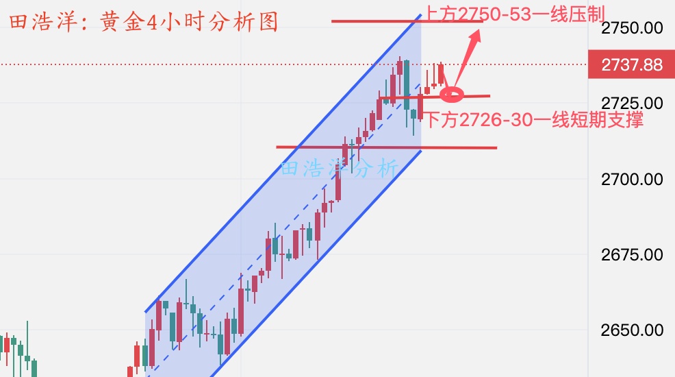 昨日黄金技术面在亚欧盘强势震荡上行破高后美盘承压2740关口迎来压制回落震荡下行破底收盘,日K线报收冲高回落震荡十字K,整体价格在2740关口出现压制调整形态,不过短期金价技术指标并未出现转折迹象,短中期均线依旧多头排列向上发散,黄金昨天最高也是上冲到我们周末给的2740一线阻力位,然后也是从2740一线完美回落,如期让我们在上涨过程中做了多,然后在2738-40一线也顺势做了空,因为周末我们就给了这样的高点,所以在此做空必然是势在必得,空单也是2720-25一线完美获利出局,相信关注我文章的朋友都能看得到,今天我们回踩继续多,做多依旧是趋势,昨晚的回撤并没有改变方向,希望与田浩洋沟通能让你