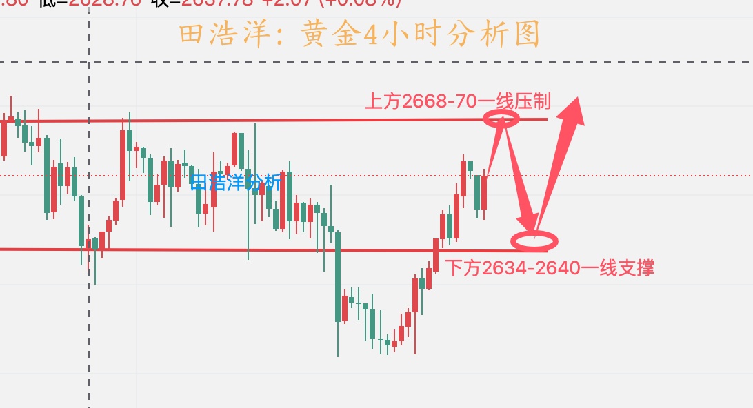 黄金周二依旧如同我们本周分析预期一样,回落2640-45一线我们实盘也是直接通知多单进场,在2653一线获利出局,昨晚我们也是在2648一线做多,都完美上方获利出局,午夜黄金反弹继续冲高2668一线,我们也是直接在实盘通知做空,凌晨一点左右在2660一线获利出局,这样操作的思路我相信关注过我的朋友都可以看得到,本周一直我就给的2668-70做空,下方2640一线做多,历史文章都是可以查询的,希望朋友们能够辨别,市场上很多马后炮,天天晒获利截图,懂的人自然都懂,希望与田浩洋沟通能让你的投资少走弯路! 从目前行情走势来看,我们继续关注下方2635-40一线短期支撑位,上方关注2668-70一线压
