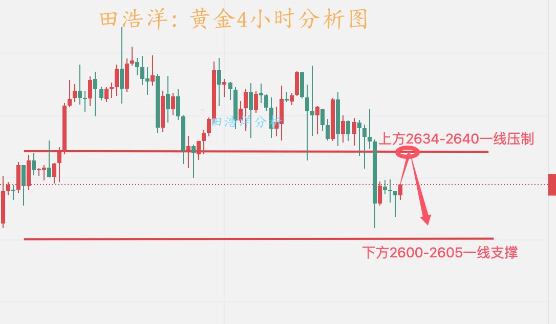 昨晚金价下跌也只是仅仅到达了2604一线,目前是第二次触及2604一线再次反弹,说明2604的支撑效果明显,在昨晚的下跌之后黄金又进入到了反弹修正额阶段,而我们短浅操作紧随其后做多,短期来看金价将进一步考验2600整数关口支撑企稳力度,不破下方关口支撑依旧有反弹的需要,希望跟上田浩洋的操作,让你的投资少走弯路! 今日上方阻力关注昨日开跌口2625-30附近,下方支撑关注2600整数关口,短期金价多空强弱分水岭2630一线,日线级别未突破并站上此位置继续保持压制偏空节奏,反抽做空依旧是主基调。具体操作策略我会在盘中提示,及时关注。 黄金操作策略: 1、反弹2630-35一线做空,止损2643,