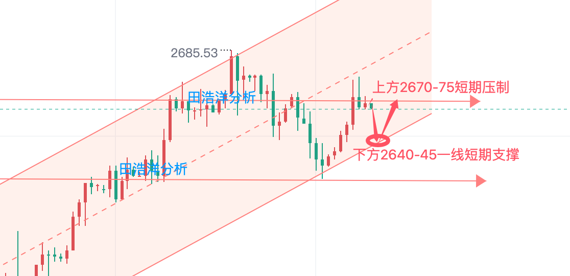 昨日黄金技术面在震荡交投中迎来单边反弹回升,亚欧盘金价依托2640关口迎来多头强势反弹回升走强,午后欧美盘连续拉升突破并站上2650关口延续多头强势格局,晚间美盘在避险情绪影响下金价加速冲高刺破2670关口并延续走强至2673附近回落震荡收盘,日K线报收探底回升强势反包中阳,整体金价在连续两个交易日回落调整后最终技术面在2625关口获支撑企稳反弹回升重回2650上方延续多头强势形态,昨晚多头没有随着消息的刺激而继续上冲,我们不追单,也不做逆势单,把握好趋势进行稳健操作,希望跟上田浩洋的操作,让你的投资少走弯路! 从目前行情走势来看,下方短期支撑关注2640-45一线,上方短期压力关注2670