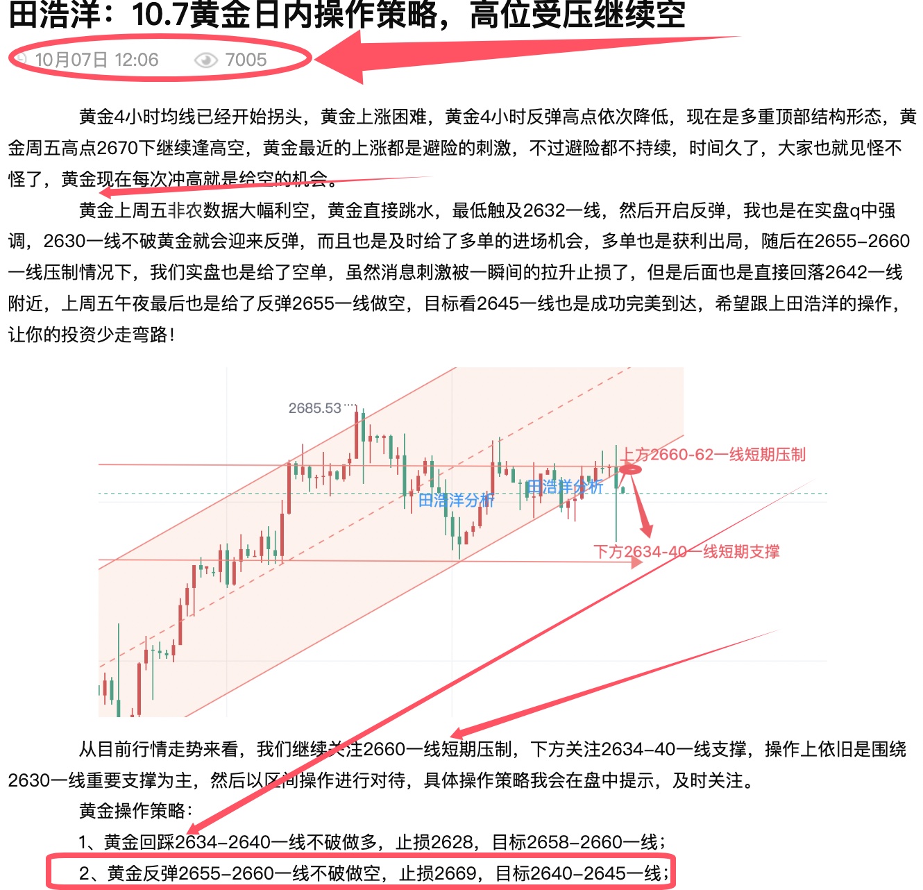 黄金周三我们实盘早盘就给了2659附近的空,下午也是给出了2640-45一线的多,都是完美获利出局,关注我薇*圈的朋友都看得到,国庆期间我们的指导都会在线实时给出,午夜我们也是给了现价单2645一线直接多,现在也是处在获利中,我们不做逆势单,把握好趋势进行稳健操作,希望跟上田浩洋的操作,让你的投资少走弯路! 从目前行情走势来看,下方短期支撑关注2640-45一线,上方短期压力关注2670-2675一线,中间位置一律多看少动谨慎追单,继续保持顺势低多节奏不变,做空只能关键点位进场,且快进快出不恋战。具体操作策略我会在盘中提示,及时关注。 黄金操作思路: 1、黄金反弹2670-75一线空,止损2