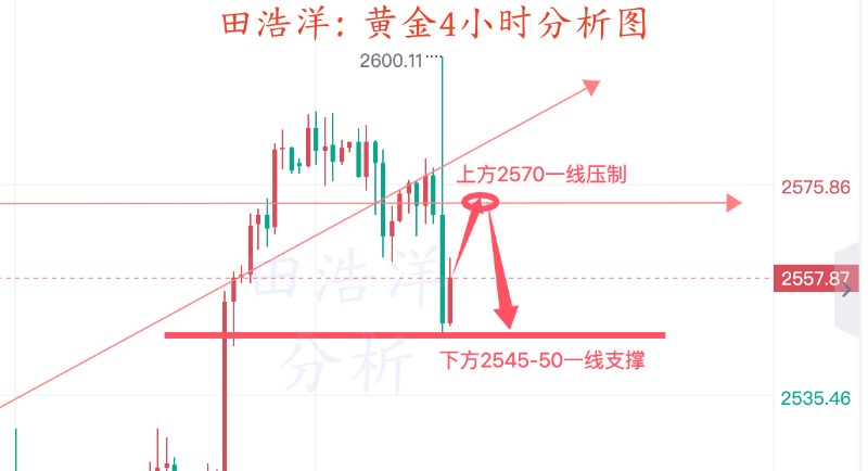 昨日黄金技术面凌晨美联储意外降息50个基点后迎来冲高刺破2600关口压制回落震荡下行破底收盘,日k线报收冲高回落震荡中阴,整体价格在2600关口出现遇阻形态,短期金价跌破2570关口整体多头强势格局告一段落,黄金上方产生了阶段性的压力,也将有可能会形成大幅度的回调。如果你投资路上比较迷茫,建议你可以和田浩洋交流沟通! 从目前黄金走势来看,黄金小时均线即将形成死叉向下,那么黄金下跌空间将进一步打开,黄金下跌就还有很大空间,黄金高位杀跌,反弹就是继续给空的机会了,黄金反弹继续空。具体操作策略我会在盘中提示,及时关注。 黄金操作思路: 1、黄金反弹2565-70一线做空,止损2577,目标2545