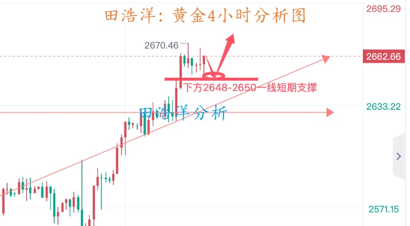 黄金周三给出了下方2650附近支撑多,相信关注我文章的朋友都看得到今天最低2649.6一线,近期黄金每天都有新的突破,不断创造历史新高,按照现在的趋势来看2700也就是最近的事情了,黄金为什么涨势这么凶?首先是美联储降息,然后国际上中东局势不断升级等一些刺激黄金利多导致黄金多头一发不可收拾,做多是趋势,但是追多又会恐高,所以我们只能看多不追多,回踩就给机会进多,这样才是最近操作的稳健之道,希望跟田浩洋交流和操作,让你的投资少走弯路! 下方支撑短期关注2650-48区域,日内回踩依托此位置继续主多顺势看涨不变,上方目标位依旧关注破高,短期多头强势分界线上移至2630关口,日线级别企稳此位置上方