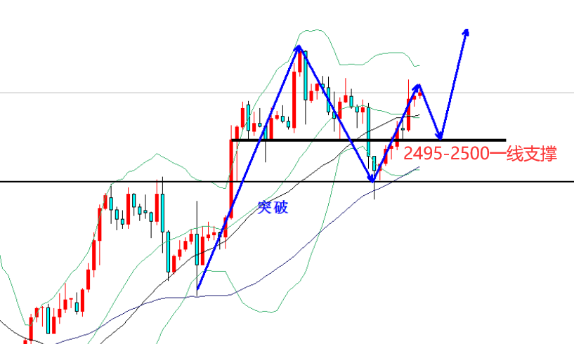 黄金上周基本上都是每日处于反转的局面,大阳线的收尾并不一定代表着多头的到来,反而迎来了阴阳交错的局面,而这种局面也让我们时常在多空之间徘徊,而上周五阴线收尾,再次跌破了短期均线的位置,最低触及到了2493附近,形态了空头的局面,介于前期的诱空,可能会给市场引起了多方面的阴影部分,但是终究还是会形成后期的突破,而短线内空头的下挫,也让市场对于多头的强劲会削弱一部分,继而,我们先以反弹做空对待! 从上周黄金尾盘走势来看,下方的重点支撑仍然维持于前期的多次试探的点位2490一线,而一旦跌破此位置的话,则前期的低点位置2470一线也将有可能朝不保夕,而上方的重点压制口则维持于前期的底部位置2525-
