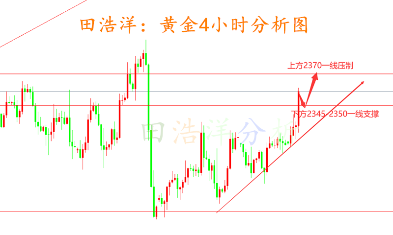 黄金周四美盘前2345一线的空单回踩2333一线全部获利出局,晚上八点半美盘开盘,初请数据利多,黄金突破近期新高,给了空头当头一棒,截至目前黄金处在2360附近震荡,以目前这个趋势,还会有新的高点突破,午夜操作上我们以回踩做多进行,多单我们先看2365-70一线,下方我们支撑看2345-50一线,回踩做多进行! 从目前黄金4小时走势来看,黄金下方支撑关注2345-50一线,上方压制看2363-70一线,操作上以回踩做多为主,文章具有延时性,起不到实时行情的具体分析,所以操作上可以与我实时交流互动沟通,具体以实盘实时给出为准! 黄金操作策略: 1、黄金回踩2345-2350一线做多,止损233