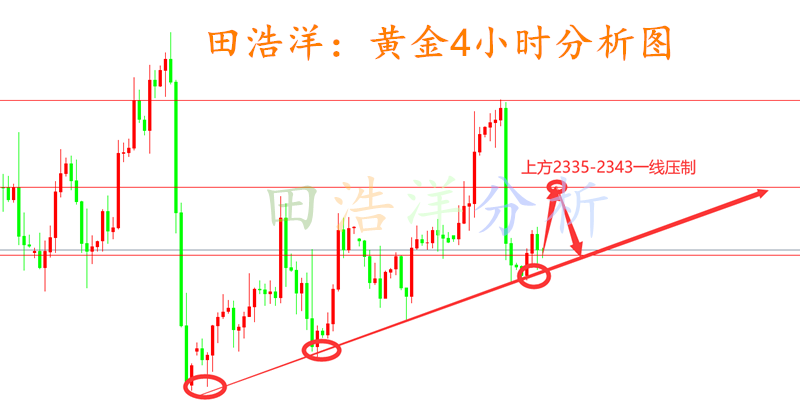 昨日黄金技术面在震荡交投中小幅冲高刺破2334关口压制回落延续震荡收盘,日k线报收震荡十字k,整体价格呈现高位窄幅震荡整理,短线来看2340下方整体趋势依旧压制偏空震荡,日线级别在未强势突破并站上2340之前日线级别大概率延续多空阴阳震荡循环节奏。 今日下方支撑继续关注2317-2315附近,上方压力关注2345压制关口,日内继续依托此区间保持高空低多循环参与主基调不变,中间位置一律多看少动谨慎追单,耐心等待关键点位进场,具体操作策略我会在盘中提示,及时关注。 1、反弹2345一线空,止损2354,目标2320一线; 文/田浩洋——专业国际市场点评,针对实际市场参与者,考虑到部分市场窗口对于