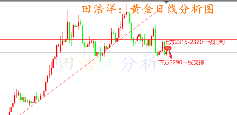 市场瞬息万变,顺势而为,才是王道,趋势来了就是干,不要逆势抄底,免得难受煎熬。交易切记不要意气用事,市场专治各种不服,所以一定不要扛单,相信很多人都深有体会,越抗越慌,浮亏不断放大,搞的吃不好睡不好,还白白错过很多机会,如果你也有这些烦恼,那不妨跟上田浩洋的节奏来试试,看看能否让你豁然开朗。如果你需要帮助,本人田浩洋会一直在这儿,但如果你连手都不伸,我又怎么能帮到你呢?下面田浩洋老师简单跟大家分析一下黄金目前的一个基本行情。 黄金昨日技术面在震荡交投中迎来空头向下加速下行破底,亚欧盘价格先行向下回撤刺破2308关口企稳震荡回升,午后欧盘小幅探底回升承压2319关口压制回落震荡下行破底,最终在
