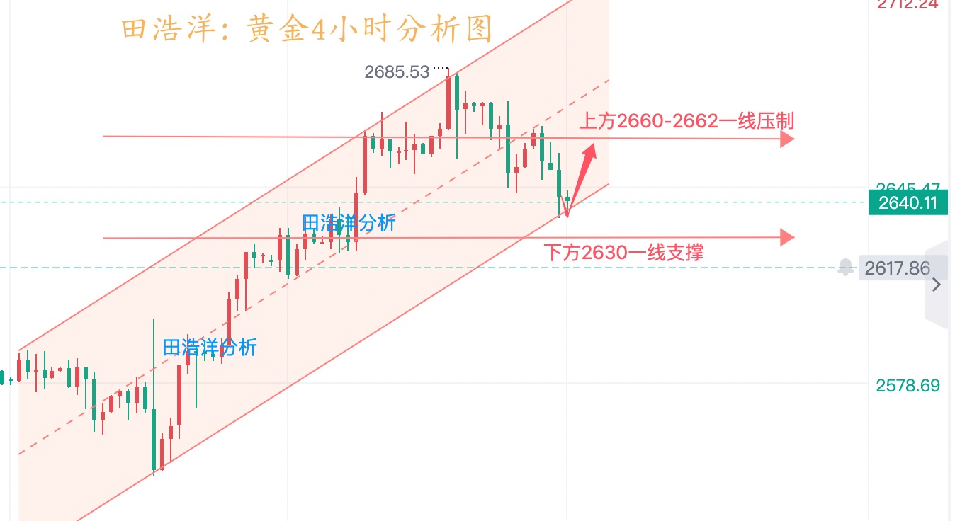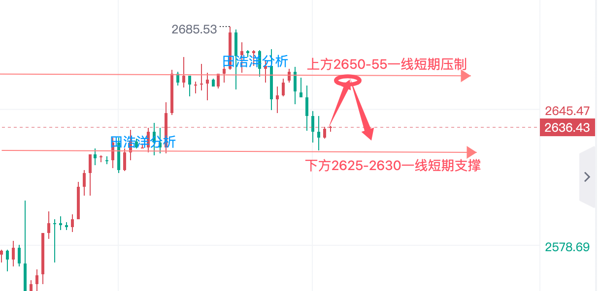 上周五金价整体在连续冲高刺破2685一线后进入多空宽幅震荡区间,周五全天压制于2674关口下方回落震荡刺破2650关口后反抽震荡收盘,日K线报收压制回落调整中阴,整体金价短期在2685关口附近出现压制调整形态,大家不要被上周五这波回踩所迷惑,不要因为下跌调整就以为行情开始反转了,只要下方2630一线的多空风水岭没成功突破,那么多头还会东山再起!希望跟上田浩洋的操作,让你的投资少走弯路! 今日下方支撑关注2650关口,上方压力关注2673-2680区域,日内继续依托此区间保持高空低多循环参与主基调不变,中间位置一律多看少动谨慎追单,耐心等待关键点位进场。具体操作策略我会在盘中提示,及时关注。