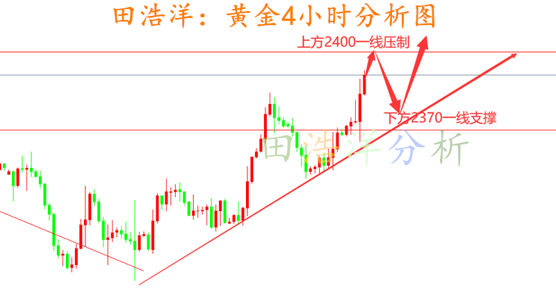 昨日黄金技术面在亚盘快速冲高刺破2397关口迎来压制震荡下行,午后欧盘二次反抽承压2394一线再度压制回落走跌,晚间美盘在初请失业金数据利多影响下金价承压2386关口再度走弱,最终延续下行至2370附近反抽震荡收盘,日k线报收压制震荡调整阴线,整体价格在2400整数关口下方出现承压形态,昨日欧盘开跌口2392-94附近成为短线强阻压制区域。 从黄金4小时走势来看,下方短线支撑关注2370-73附近,整体依托2370-2395区域保持高空低多循环参与节奏布局,短期多头强势分界线关注2350关口,日线级别企稳此位置上方依旧多头偏强震荡,具体操作策略我会在盘中提示,及时关注。 黄金操作策略: 1、