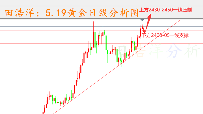 黄金周五白天经过小幅度回撤修正之后,早间开始筑底企稳,于2370上方开始短线发力,截止到美盘,再次刺破于2400附近后到达2419一线止步,短线内黄金也将继续刷新了近期内的高点,有意逼近前期的高点,但总体而言,目前的趋势仍然偏向于强势,震荡上升结构持续拔高,下方多头生命线关注2398-2400一线周四高点小时图波段开跌口。回踩这里做多。守住不破多头一马平川突破前期压力2430并且看涨2450一线。跌破之后价格才会考虑短期头部形成,价格便会宽幅V型整理并朝下吞没各个阶段支撑位置。至于结果我们看市场动向最终选择!下周不追多看涨等回踩2398-2400做多! 从日线黄金走势来看,黄金上方压制关注2