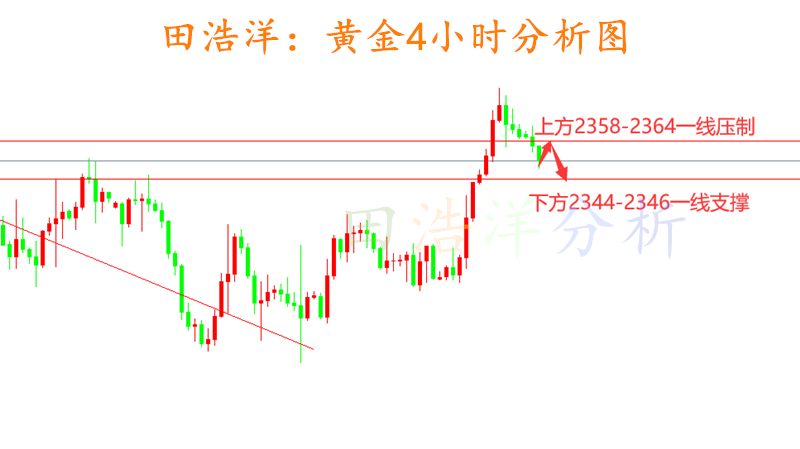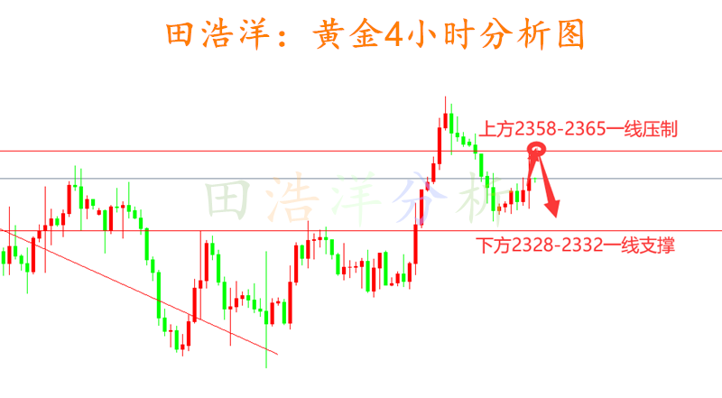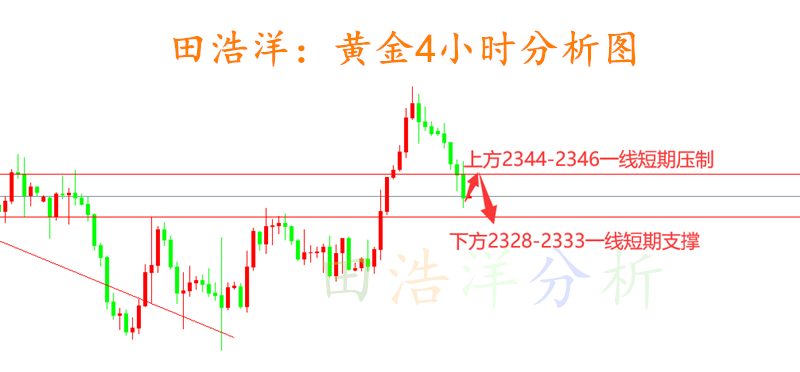 黄金周一开盘走势正如我们周末所分析一致,开盘会进行低走,黄金今天开盘最高反弹2364一线便不再延续冲高,今天我们也是给出了2364一线的压制做空,反弹做空的主要思路,下方2340一线目前已经被突破,多空分水岭在2330-33一线,如果空头继续发力,那么下方重要支撑也会随之被突破,具体我们重点关注2330-33一线支撑位置,反弹做空为主,希望大家不要逆势抄底,以反弹做空为主进行布局! 从目前黄金走势来看,空头依旧比较强势,我们下方关注前期支撑位置2328-2333一线支撑位,上方关注2344-46一线短期压制,操作上我们依旧以反弹做空为主,回踩不破做多为辅,中间位置不要追单,具体操作策略我会在