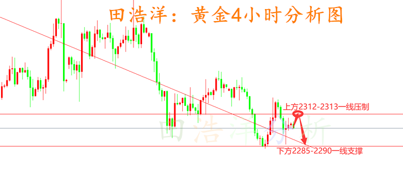 昨日金价技术面迎来多空宽幅震荡过山车走势,亚欧盘价格承压2326关口压制回落震荡下行走弱,午后进一步向下击穿前一日凌晨低点2307关口并延续下行击穿2300整数关口再度走弱,晚间美盘在初请失业金利空影响下金价弱势反抽承压2304关口再度压制回落下行破底,最终金价加速下探至2285关口附近反抽重回2300整数关口震荡收盘,日k线报收压制震荡中阴,整体金价连续两个交易日呈现多空宽幅震荡过山车走势来回拉锯,今日上方阻力关注昨日欧盘开跌口2315-2318附近,日内反抽依托此位置继续先空下看回落。 从目前分析来看,上方关注2312-2313一线压制,下方短线支撑关注昨日低点2285-2290附近,短