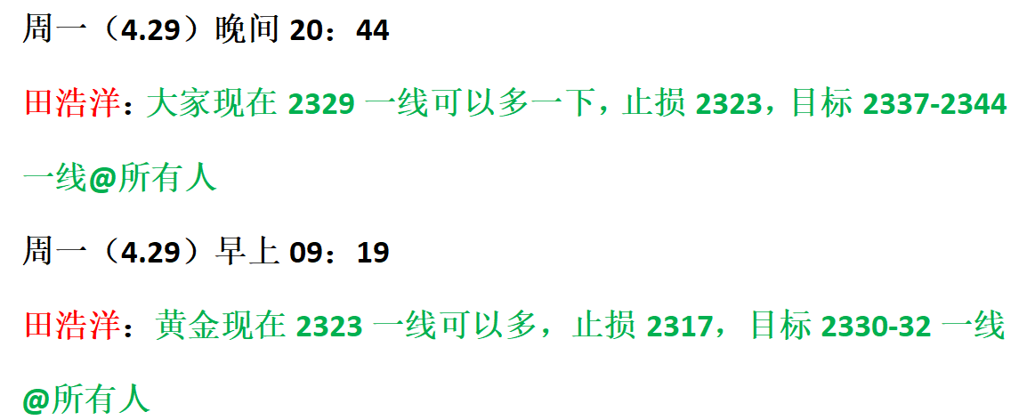 投资是一个长期的过程,也是一场修行之旅,心急吃不了热豆腐,财不入急门。想做投资森林里的猎人就得有耐心,不然你就会成为猎物被人收割!再多的话也没有一次切实可行的盈利来的实在,人生不如意之事十之八九,想象与现实总是有那么大的差距。或许田浩洋的一句话,能帮你突破困扰很久的问题,或许我的一个交易观点,能帮你避免几千甚至上万美金的损失,或许你一次的尝试,让你找到正确的投资方向。 黄金技术面分析: 黄金周五比较走正常的技术面,早上开盘回踩震荡,然后慢慢震荡至2330一线上方,白天就开启了震荡上行的局面,周五最高也触及了2352一线,晚间美盘后开始震荡回踩,截止目前最低也是到了2328一线,白天我就实盘分