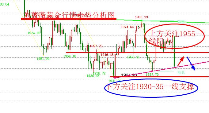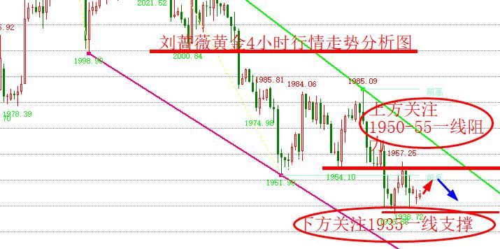 黄金昨日中阴线下挫收低,反弹最高1970一线承压,整体维持在区间内震荡,中轨附近承压后回测至下轨,最低1938.50.尾盘收在低位,日线继续在区间内酝酿破位,伴随着探高回落的走法,反复蓄势破位当中,短线则是迂回反复。结合日线的收盘来看,倾向于整理后蓄势向下,美元横向整理有进一步冲高之动能。 黄金4小时图布林道开始平行收口,昨日点到上轨即止,上轨承压摔至下轨,而目前的宽幅震荡区间在1984-1930.等待区间突破,反复的冲高回落不破上轨。后市在酝酿破位区间选择方向。4小时图收低。局部短线偏弱。小时图一波探高后快速连阴回撤,收在低位,今日亚欧盘适当反弹修正后再下跌,阻力在1950-19