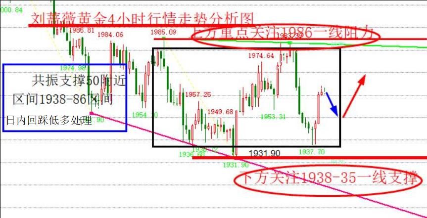 黄金从日线图看,昨日金价冲高后回落收实体阴K线形态,目前MACD指标双线已经发出死叉变盘信号,暗示后市行情或将会进一步向下回调试探底部支撑,不过KDJ指标开始走高,需要密切留意MA5均线对价格的支撑力度。 黄金4小时图看,经过昨日一轮探低回升后,目前金价已经收复五月中下旬的下跌幅度,虽然MACD指标双线仍在金叉运行过程当中,但现阶段价格面临前方多次承压的压力位,下周或有机会出现回踩测试底部,需要关注下方MA5和MA10两道关键均线的支撑效果。综合上述分析,下周操作上刘蔷薇建议回踩做多为主,下方关注1935-1940一线支撑,上方关注1970-1965一线阻力; 黄金下周操作策略建