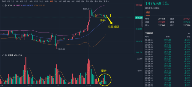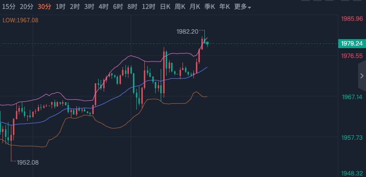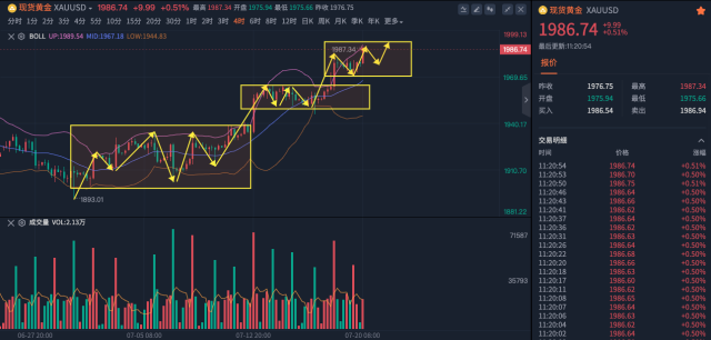 美联储今年第五次加息落地,黄金却涨回了1980,这其中是什么原因?虽然今年不会降息了,但很可能不再加息了,对这可能的最后一次加息,市场开始炒情绪的预期,这是一方面;就业增长强劲,失业率保持在低位,暗示着经济比较好,通胀预期上涨,想守住低通胀不能让美元太强势,这不是情绪化的,这是根本性的,所以两个方面黄金不跌反涨。 刚公布的时候上下拉,但幅度不大,维持在1968附近时间比较长,随后放量上涨接缩量下跌,再接拉升最高涨到了1982,这又把简单理解加息就利空黄金要跌的给套住了,被套的原因不在行情的判断,而在自己不带止损,使得自己处于被套和解套的恶性循环中,注意找回调机会先把这次给解出来。 那么黄金上