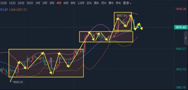随着周五如预期跌到1956,本周我们在五天中看对了其中四天的走势,大家本周的战况又是如何呢?只要不犯基本错误,比如扛单被套、重仓被爆,剩下的就是交给命中率了,先找内因,再找外因。下周四美联储利率决议,黄金是转向空头了,还是调整继续朝上呢? 先来回顾一下本周的行情,大家对照一下看看自己本周做的怎么样: 周一:我们看反弹1960回调到1947/1944,结果最高反弹到1960,最低跌到1946。 周二:我们预测数据走低,利多黄金,小于预期小于前值单边涨,黄金涨到1985,结果最高涨到1985。 周三:我们看反弹到1981回调到1967,结果最高反弹到1981,回调到1969。 周四:我们看197