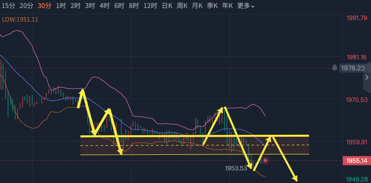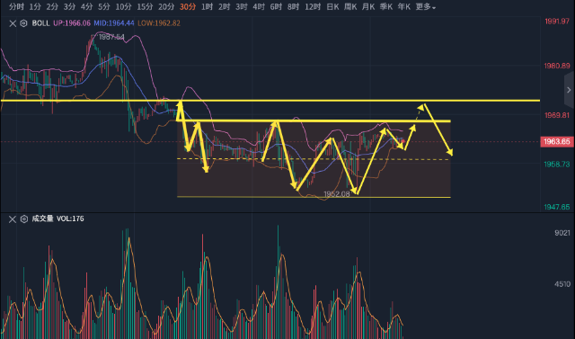 今天的行情会特殊一点,因为转钟之后凌晨两点,就是美联储利率决议了,届时会有不小的波动,当然也有时提前消化一部分预期,这是因为市场提前布局的量在权衡,所以今天的美盘就要打起精神来,那么黄金今天大概率会怎么走呢? 无论是四小时,还是半小时,两个级别的中枢震荡都没有破位,我们参照30分钟的中位区间震荡,连续看了三个回调了,且都拿到了,那么昨天收阳柱了,今天这个区间还有效吗?昨天在1952探底后,成交量在下降,但价格在走高,这是缩量上涨,且之后没有打来拉升,说明这个后续拉升还没走出来。 今天上午出现了超卖背离,但价格也没有下跌,这说明多头的牵制力量很强,而从日线的形态来看,实体阳柱把黄金的颓势救活了