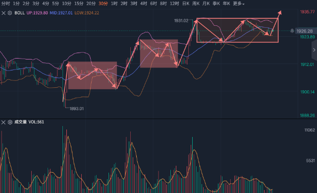 如同我昨天所说,黄金开盘后可能先阴跌,不仅是现在看,上周收盘时,我们看小时级别的收线就已经兜不住了,那么今天开盘后黄金低走,把15分钟的空间给打开了,这也和上周五收在1957也就是周线布林中轨下方有关系,收上面可能就高开高走,收下面就要大概率先阴跌。 我们看趋势就是找线索,给到我们的另一个线索是四小时级别的量价关系,呈现缩量下跌,在高位出现这种量价关系,需要保持怀疑的态度,怀疑庄家偷偷出货,目的是不让散户发觉主力资金已经退场,给人一种洗盘的错觉,日线空间没打开反而被小级别往下打开,这种局面下再去找多一次拉升就不太明智了,我们上次根据中枢构成条件,在高位看回调现在来看是正确的。 不强势的消费、