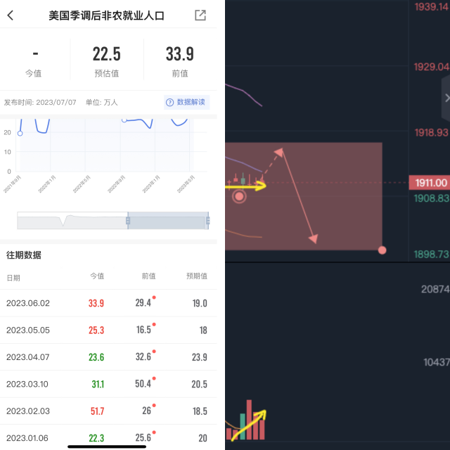今天黄金迎来正式的非农,昨天的小非农我们预测走高正确,也预测黄金最低跌到1906正确,那么今天非农数据怎么解读呢?是直接照搬小非农走高而利空黄金吗?我们先来回顾一下今年的非农数据,和公布时黄金的价格涨跌: 6月2日:>前值,>预期,黄金跌。 5月5日:>前值,>预期,黄金跌。 4月7日:<前值,<预期,黄金跌。 3月10日:<前值,>预期,黄金涨。 2月3日:>前值,>预期,黄金跌。 1月6日:<前值,>预期,黄金涨。 这个列出来,就很容易发现:大于预期,黄金跌,小于预期,黄金涨。那么唯独4月不走寻常路呢?4月要单独列出来,它是靠近预期的,只要是悬殊不大的,符合市场预期的,都会被提前消耗殆尽