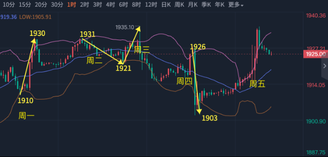 无论成绩如何,每周都要总结一下,本周连对了四天,周五没能收个好尾,自6月15起的连胜终止了,那么我们现在来回顾一下本周的行情,再来解读一下下周的重磅数据CPI、PPI。 周一,我们看回调到1913看反弹1925,最终回调到1910,反弹到1930。 周二,我们看反弹到1933回调至1921,最终反弹到1931,次日回调到1921。 周三,我们看回调到1921破1930涨到1935,最低接前一天跌到1921后涨到1935。 周四,预测ADP数据走高正确,预测黄金反弹到1923附近跌到1906,最终反弹到1926跌到1903。 周五,预测非农数据利空错误,数据利多黄金上涨。 本周有很好的收周线阳