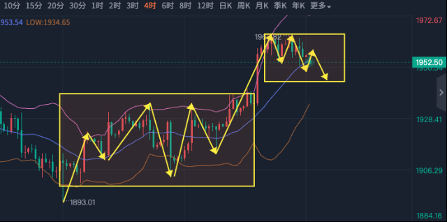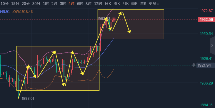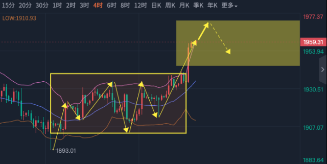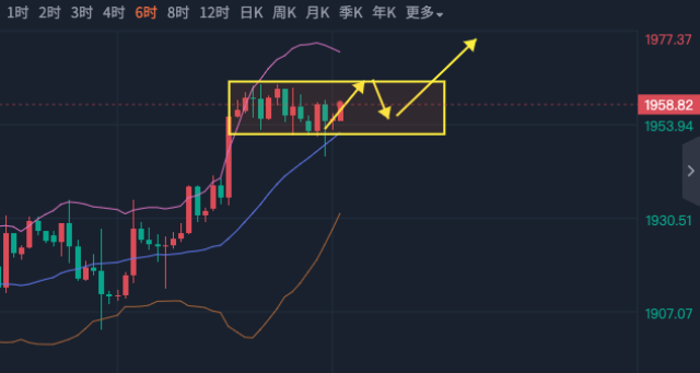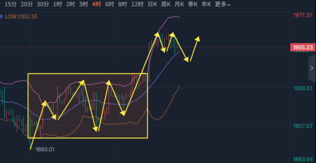 CPI和PPI双双走低,对黄金是利好的,而且黄金有希望再次去冲击2000,为什么这么说呢?低通胀下就降低了美联储加息的概率,美元不强势对黄金利好,那么随着数据的公布,本周也进入尾声了,今天周线怎么收呢? 首先说周线的形态没有爆冷,在前两周的双底下接了大阳,这是非常规律的走法,但日线空间还没有打开,这也是导致黄金在高位不能进一步施展的原因,昨天的PPI的确走低了,但初请显示出来就业的好转,经济的强势,其实美元并没有反弹,所以出现了美元跌,黄金也不涨的局面,黄金在数据公布后先涨后跌,但反弹的幅度很小,其实跌幅也很小。 那么我们从哪里入手呢,不妨从4小时找找信号,4小时在数据过后走了缩量的上涨,那