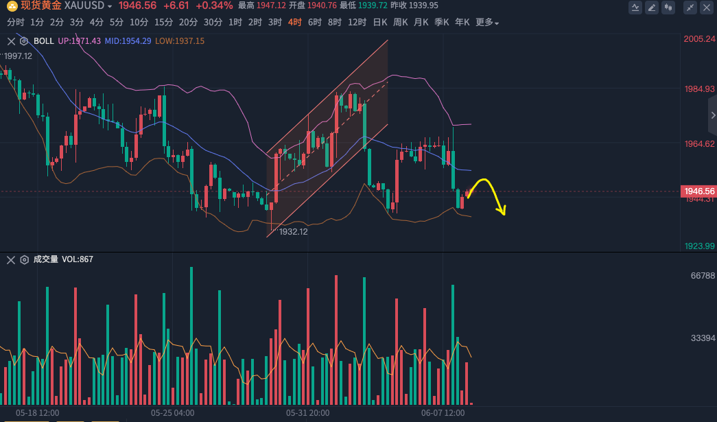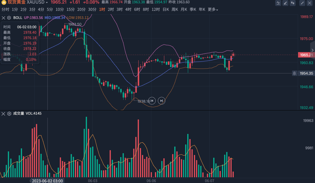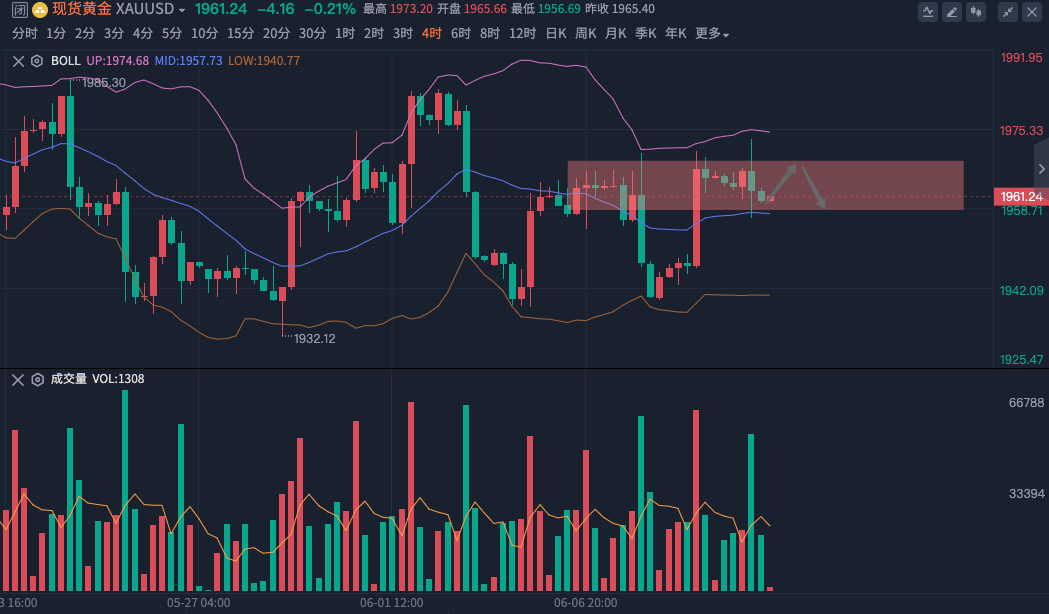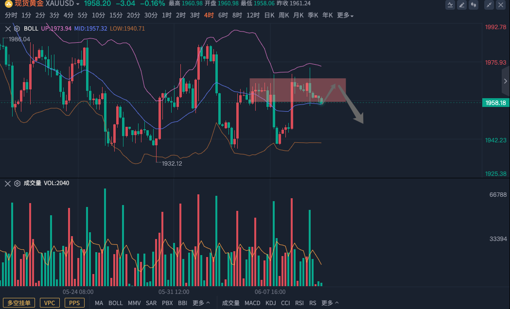 本周二美国将公布最新的CPI数据,5月份整体通胀年率为4.1%。这是在4月份仅小幅放缓后,再次出现的大幅放缓。那么总体通胀率的下降预计是受到能源价格走弱的推动,这表明,普通汽油平均价格环比下降了2.1%,而剔除波动较大的食品和能源行业的核心CPI年率预计将达到5.2%,二手车价格将使核心CPI保持在高位。这些数据将于美联储6月利率决议前公布,预计它们将增强美联储的信心,即本月暂停其历史性的加息行动是有道理的。 黄金今天低开低走,这对于周五急涨中看涨而套多的人是不友好的,可能二次探底要先走出来,毕竟周五的急跌是放量的,不是缩量的底部支撑,所以如果有套多的,考虑要在破位1957离场,不要越套越深