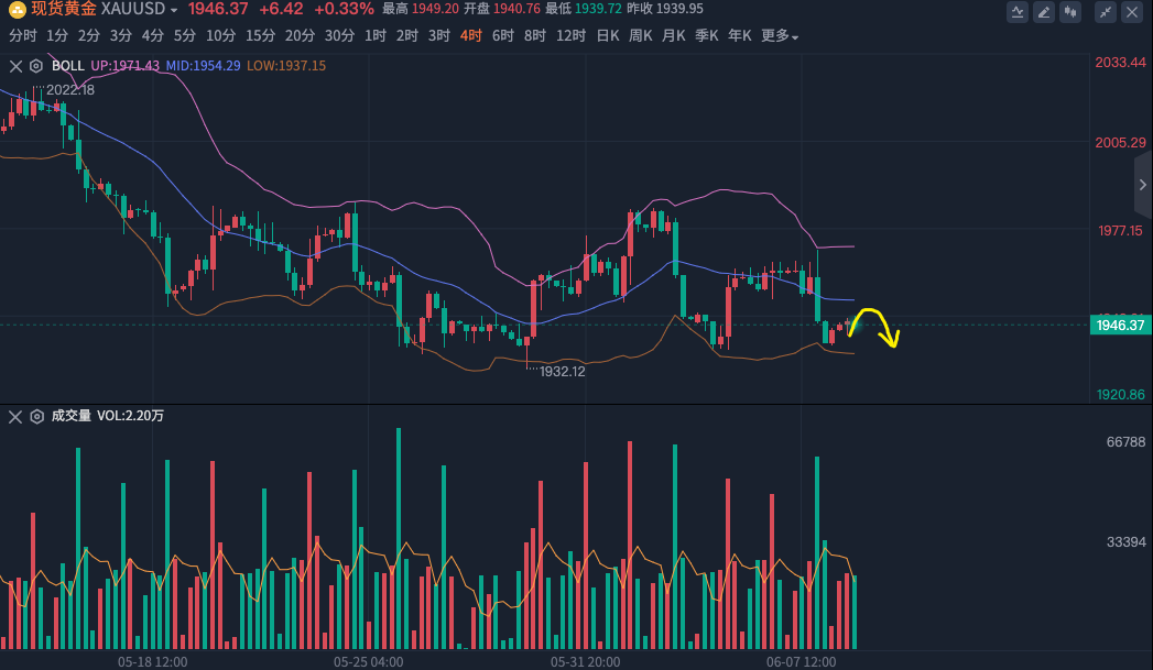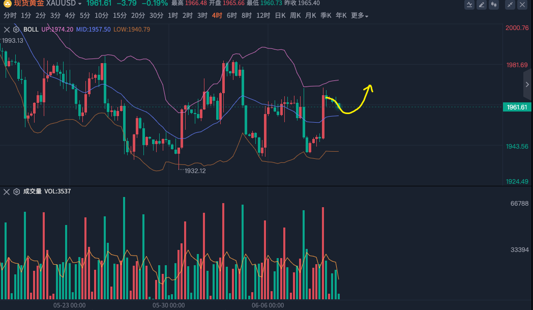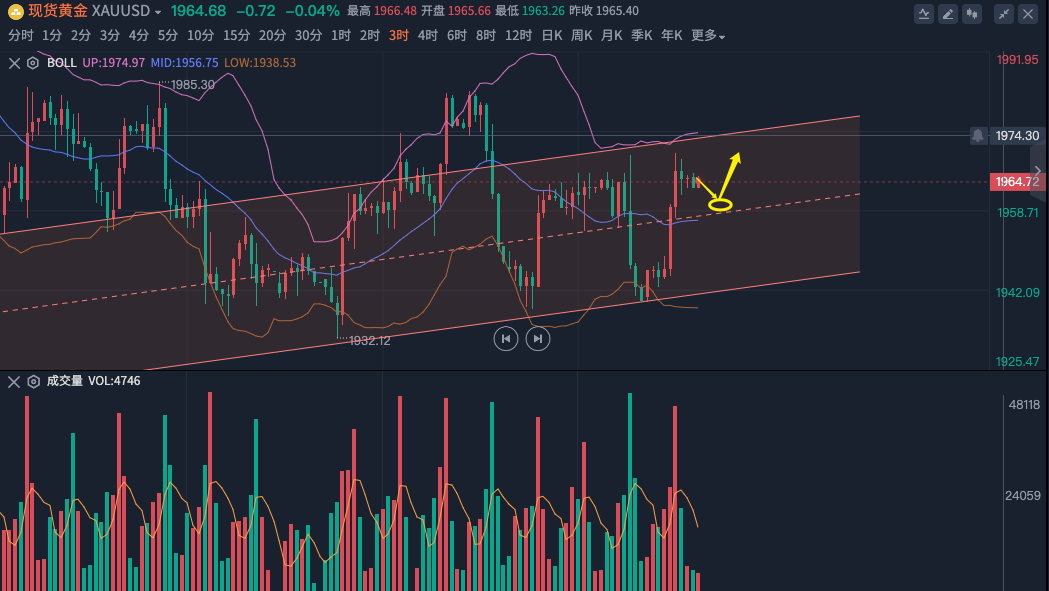 两个小时前,老陆在黄金1958的价格写了一篇分析。 给的思路是回调到1954/1952附近看反弹,看的空间是上来到1960/1962,短短两个小时,是已经完成了弱势中的反弹的,现在已经涨到了1966。 在日线布林中轨压制的情况下,见上篇分析,我们做出弱势反弹,很快拿到了结果。 本文由陆盎司撰稿,一个在市场有多年交易实战经验的人,擅于用缠论、量价关系等分析价格走势,擅于对韭菜进行改造,老陆微Luu535成熟的交易体系,众多人受益匪浅,很多时候思路通了,一切都通了,在我这里没有任何花里胡哨的包装,只有实实在在的经验可学。
