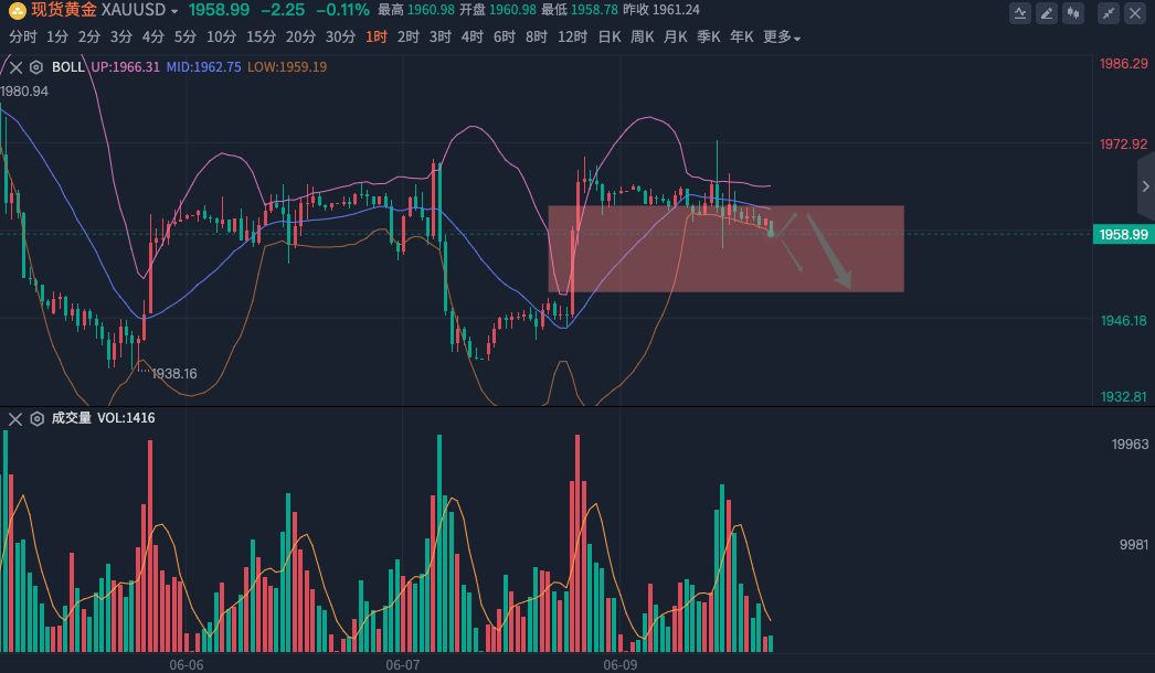 黄金开始有动静了,1小时布林带开始缩口,那么就会有方向出来,我们上午说过了,是阴包阳形成空方炮,还是二次拉升,形成第二类买点,进入上一个空间,周线收官之际可能会给我们答案。 最新初请数据和四月份的批发销售月率,都是利多黄金的,也看出来了经济稍显低迷,抓住这个美元不会提前涨太多的基调,我们就敢看涨黄金,那么对于下周公布的CPI,市场预期是走低的,那么也就是希望美联储本月不加息,隔月加,那么这种可能性,只要在美元不太强势的表现下,是完全可能的。 目前美元在假企稳,黄金在假探底,黄金我们等到1960/1958就可以考虑看涨,今天的周线收官价格可能在1965的上面,我们今天给了另一个思路,可以舍弃掉