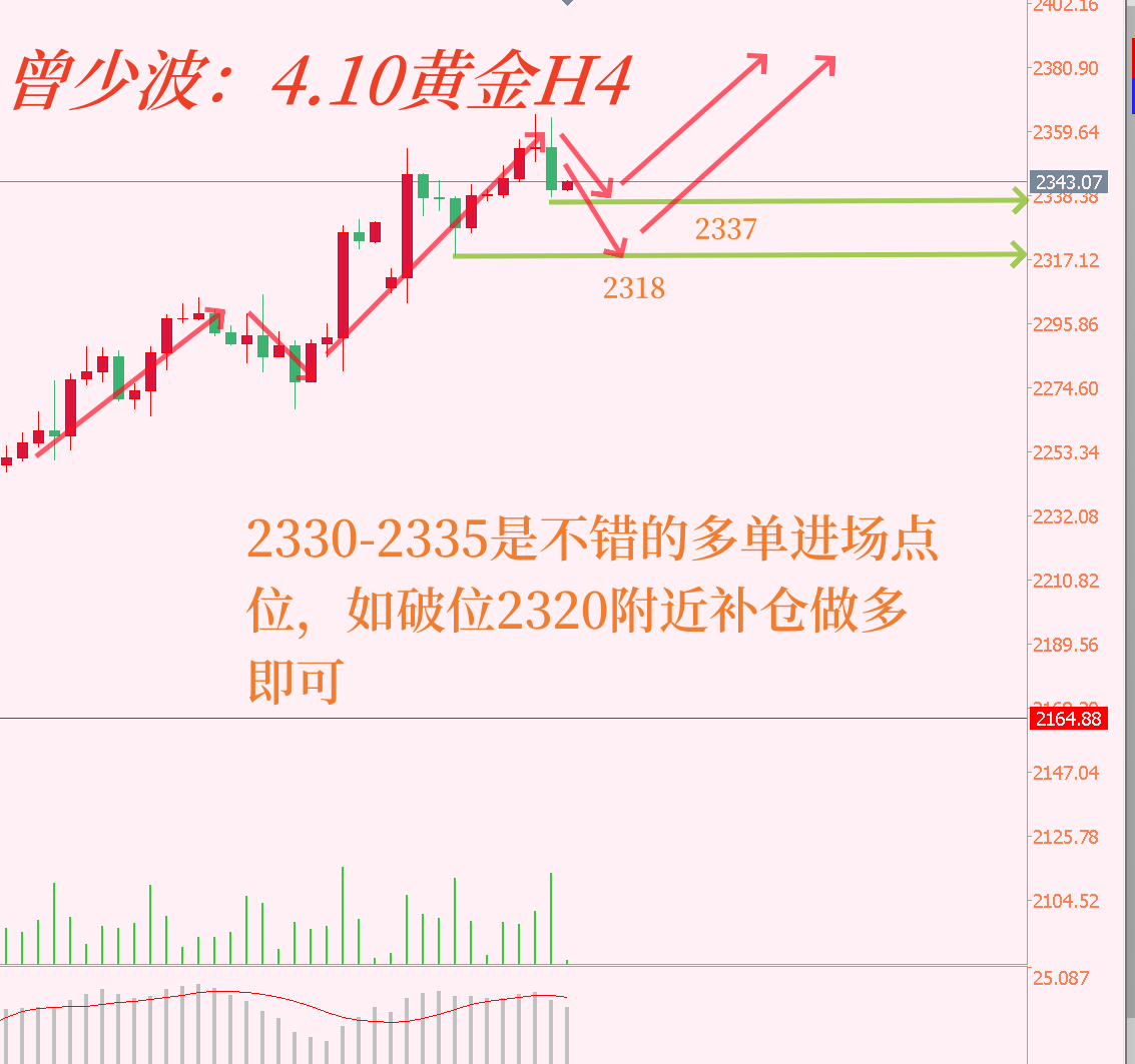 曾少波:4.14黄金下周走势分析及策略建议 朋友们周末愉快!上周基本上较大的行情都是在美盘中后段,也就是后半夜,近几周时间也是没来得及好好休息,周六补了一天的觉,关注曾少波的朋友们也要注意好放松调整,盈亏都不应影响必要的生活节奏,否则就全乱套了,市场生活两头都不能经营好。今天周日也要好好放空心情,再补充精力准备好下周的市场之旅。 黄金价格周五晚至周六凌晨下挫最低到达2333美元,距离2302目前最高支撑仅30多美元,周五尾盘末似乎触底反弹有接触2360-3265一线阻力的态势。那么我们的趋势看哪?如何入场? 走势分析: 通过周线可以看出仍是收阳,所以短期仍是看跌需要谨慎。一直是那个观点,对比