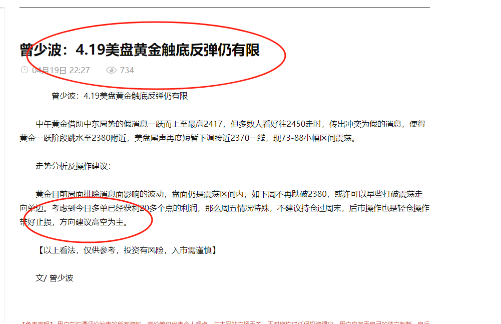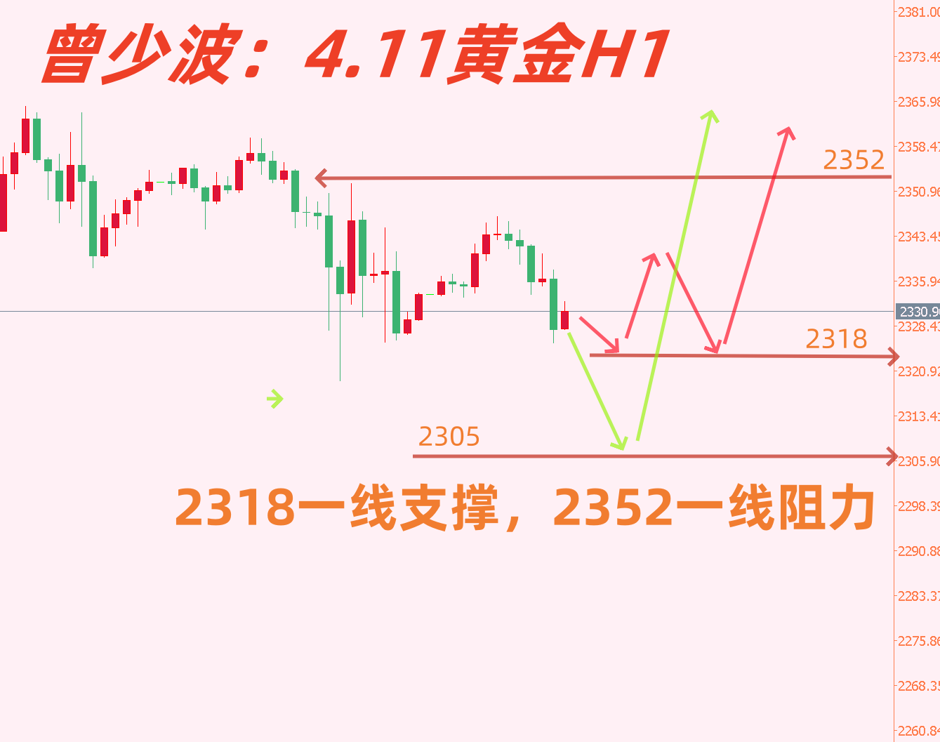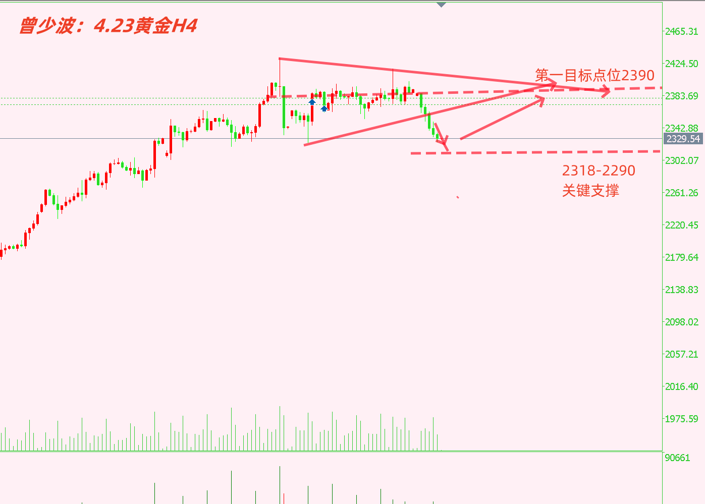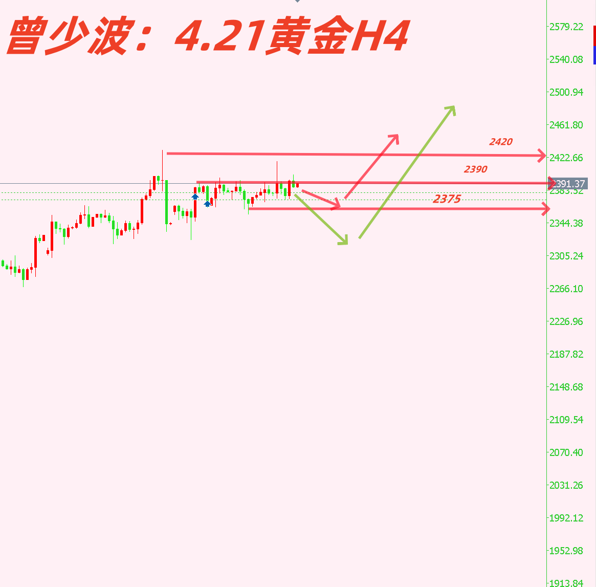 曾少波:4.23黄金走高需回调,空头已然成型? 早上好!多头目前短线屡屡受挫,别急!且再看它一到两日,关键支撑位还在。知道演员成功的标准是什么吗?把伪装做到真实,目前的行情就有这种意思,两年来历史最大单边跌幅、像之前多头一样稳扎式下跌,这就是空头最好的伪装,越是扬言历史大顶的人,实行起来挫败感将越高。多头只差一个合适的低点!两个多月400个点的涨幅会被这点急搓劝退?空头不死多头不止,耐心等待机会! 国际要闻: 1.美gu周一收盘各大股均上涨。 2.金价创近两年来最大单日跌幅中东局势担忧有所缓解。 3.台湾花莲县海域发生6.3级地震。 4.德商银行将其对黄金的年底价格预测从2200美元/盎司上