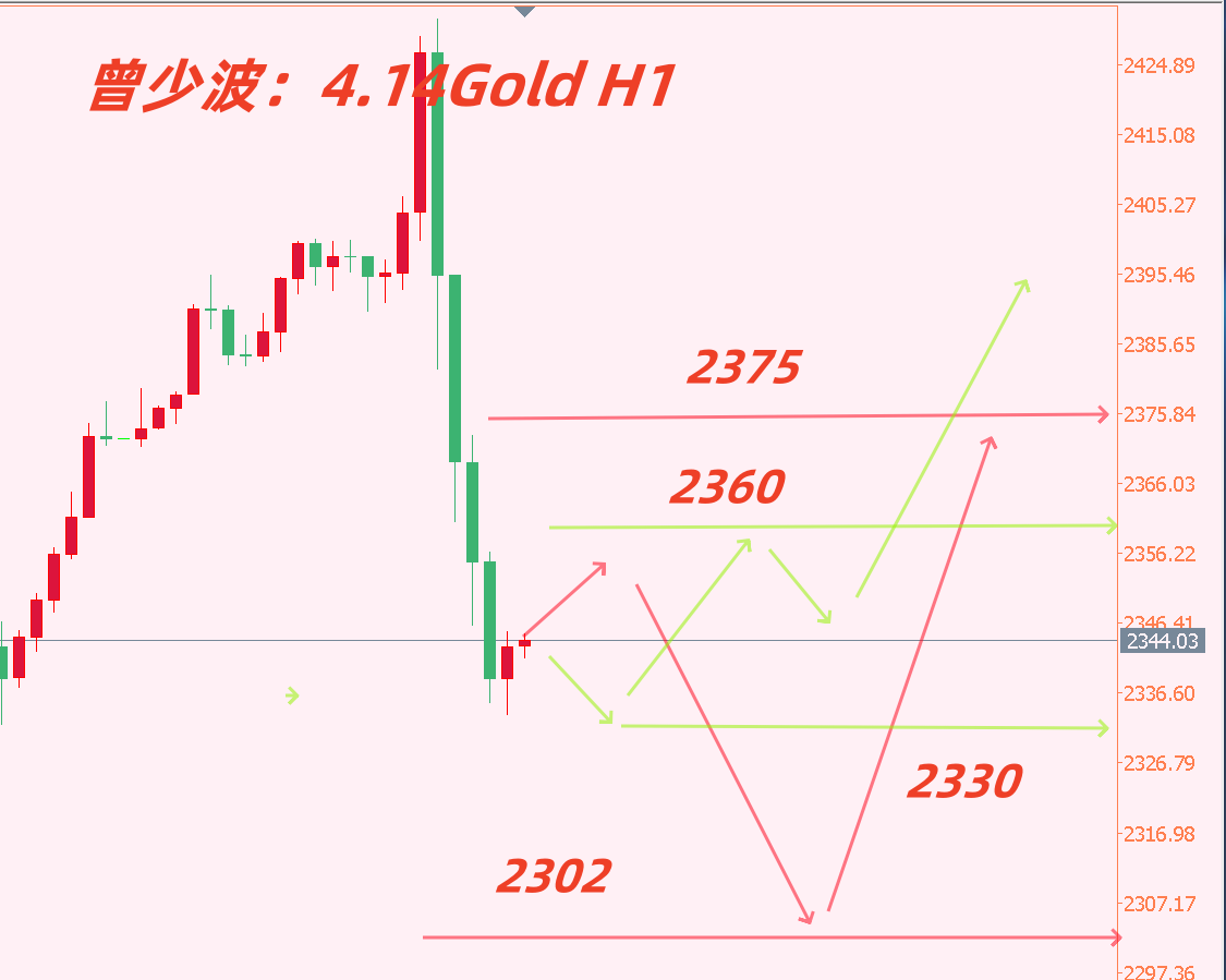 曾少波:4.13黄金下周走势及分析 朋友们周末愉快!黄金价格昨晚下挫最低到达2333美元,距离2300美元整数关口仅有30多美元的空间,加之技术形态的初步成型,个人预期不排除再探一次2300美元整数关口的可能,如若再破,那还有一定的延伸空间。但周线还没有出现明显的阴线,所以短期仍是看涨趋势,对比近两个月的连续涨势,100美金下跌不算什么空头信号,最多是美元上涨,美丽国主力出货套现。后期关注关键2320一线支撑和2365一线阻力。 分析走势: 通过对黄金小时图解析得知,昨日行情如期到达上方我们的目标位2430一线冲高回落,从回来的走势来看依然依托下方的均线系统的支撑,虽然调整的幅度比较大基本上