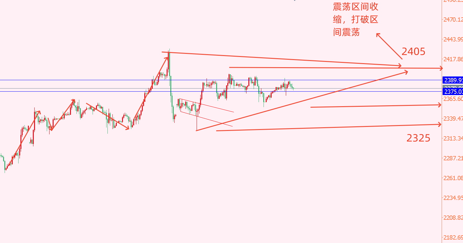 曾少波:4.21黄金周分析及策略建议 当下盘面周五虽然在以伊消息面刺激下达到2417,但随后消息证实虚晃立马下调至早间价位水平,等于这波倒v走势可以排除在走势分析外,那么区间震荡仍然未打破。值得注意的是,如果下周没有在2375点位下长时间停留,那么本周尾声震荡可能结束,因为2380-2400高点将是下一个走势的低点,从而完成顶底转换。 我们之前说过,观察近期走势,震荡区间顶底逐渐上移并压缩,震荡区间顶底会越来越靠近2390位置,最终打破震荡走向单边趋势。针对这种走势我们做空的机会可能会越来越少,风险也越来越大;做多的入场点位也越来越高,判断入场时机点位也越来越困难,