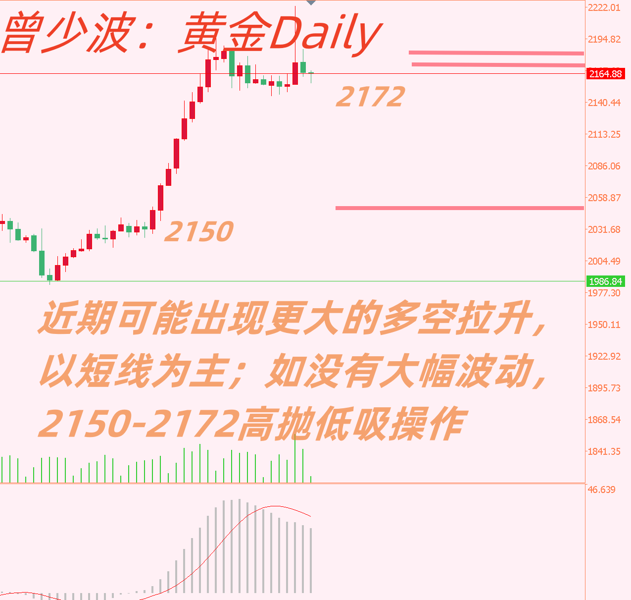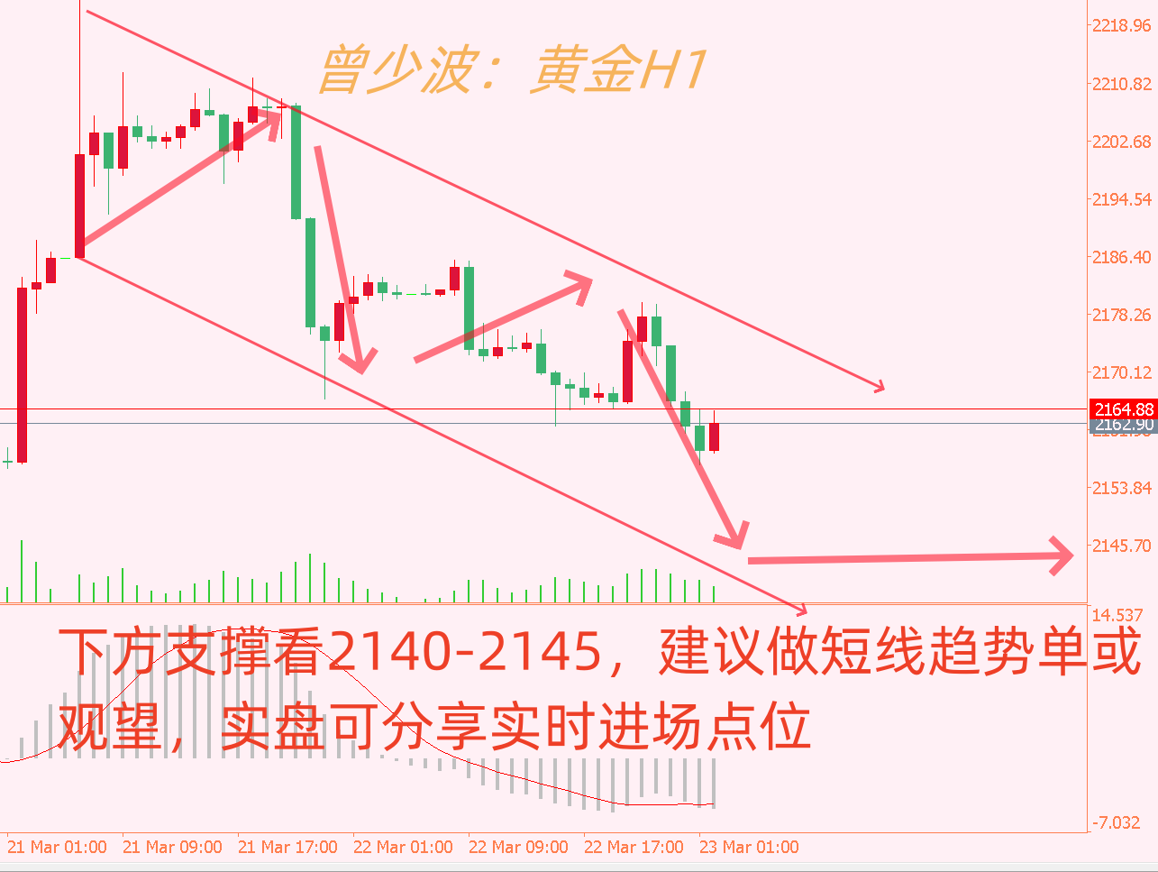 曾少波:3.25早评,黄金长线低行后高走是方向 投资朋友们早上好,新的一周,开盘大吉!近期黄金受消息面影响波动较大,地缘政治,美联储释放的信号让黄金价格此起彼伏。一时间趋势到底是哪让人捉不着方向,个人看好未来数周甚至数月之内黄金会呈现低行后高走的走势,低位不仅是2146可能更深,高位不仅是2230,甚至远高。由于新低新高准点难判断,反倒中长线暂时不太好做,稍长的短线才是王道。 上周黄金复盘: 本周的行情可谓跌宕起伏,鸽派鲍威尔,美联储消息使得金价一跃最高至2222,昨日金价也迎来过山车式波动,从最高2212,跳崖式跌倒2166,随后攀升至2184附近,至今日中午,再度回调至2172附近,早间