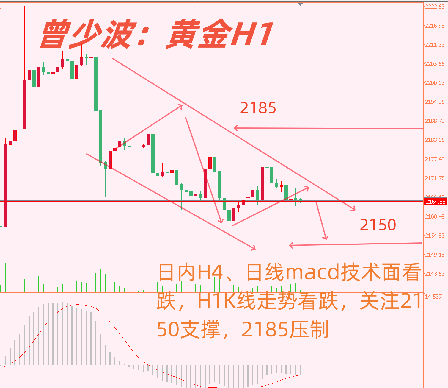 曾少波:3.27黄金2171触底反弹? 投资朋友们上午好!激进行情下,我再一次在某些平台看到了不让客户单边情绪的单边情绪分析师,这些喊单难道是有技术含量有所依据的吗?要说有依据,那最可能完全是为了侥幸挽回错误预判的再次错误。反而,曾老师给的每一单都是有理有据,同时也在昨天的行情下收获颇丰。比如近期行情,H1,M5 可以很好的判断趋势从而保持高胜率的做单。如果想学到技术分析,请关注曾少波,或联系交流体验。 黄金走势复盘: 昨日欧盘三段大涨杀翻空军,美盘两段激进下调掌脸多单跟进,凌晨下调至最低2171后早间反弹至最高2180; 技术分析: 1小时,日线图 MACD均在中线上方交叉向下,看跌信号持