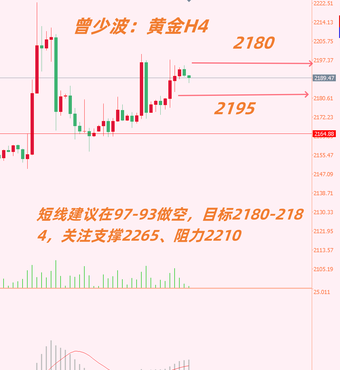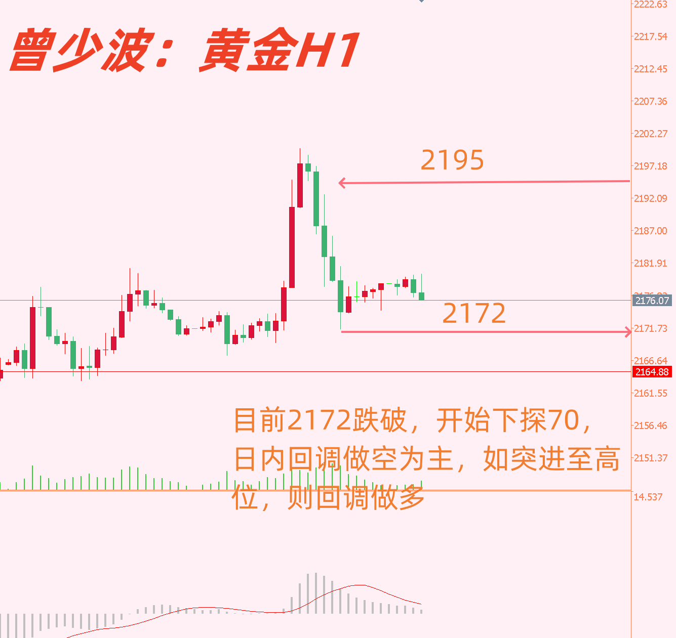 曾少波:3.23周评,黄金本周复盘,下周策略分析 投资朋友们周末愉快!本周行情走过后,是否也无风雨也无晴般保持自如;是否内心波澜一去不复返,亦有再战楼兰之决心;是否复盘反思,寻市场之明灯? 本周黄金复盘: 本周的行情可谓跌宕起伏,鸽派鲍威尔,美联储消息使得金价一跃最高至2222,昨日金价也迎来过山车式波动,从最高2212,跳崖式跌倒2166,随后攀升至2184附近,至今日中午,再度回调至2172附近,早间收盘在2165。这种行情,市场上很多自信的投资者肯定有不少被套,可以联系曾少波帮你分析解决办法。 技术分析: 黄金四小时线短线看还是空头形态,大阴线继续击穿支撑位,同时出现黄昏之星,就是顶部