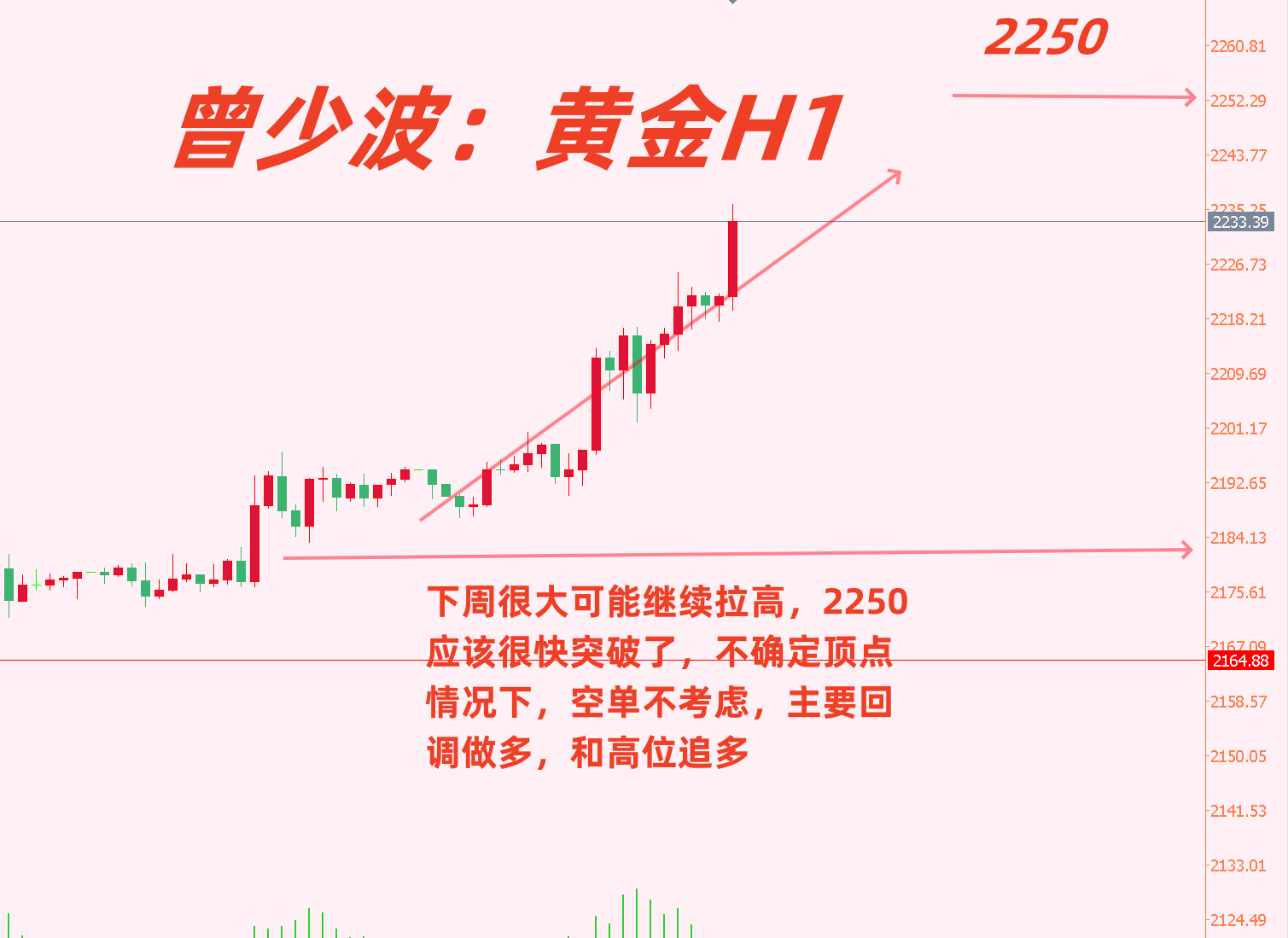 曾少波:3.30黄金走势分析及下周操作建议 现在又是美指相对黄金大涨来说是高位了,也就是说黄金涨的有点过了。至于说为什么黄金大涨,其实简单来讲就是主力资金在拉升,从而带动散户跟进,形成市场合力的结果。其它的理由和逻辑都非常无力。这中走势上周已经见识到了有两次较大大回调了,投资者做好高位回调再拉升的的准备。 走势复盘: 黄金在周五凌晨收盘时十分钟左右再延续一波冲势,拉高至2236,在2233收盘,很明显大盘在和散户做心理战,散户不肯持仓过夜,多头早早收拾离场,更不用说空头早已被横扫出局;本人认为,周一会仍会延续涨势,2250在即,同时提防再次大涨前的大回调。 走势分析: 黄金美盘探底回升,小时