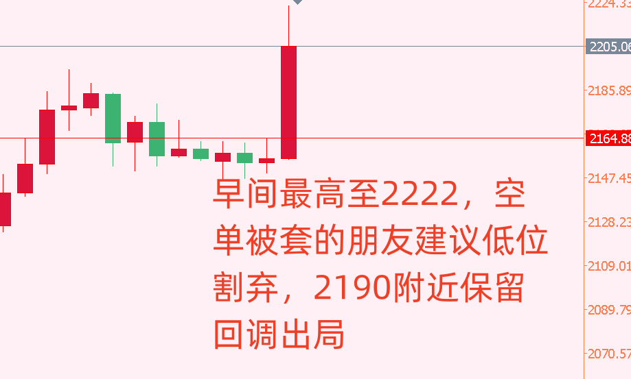 曾少波:3.21美联储降息预期削减,金价最高破2222 投资朋友们早上好,昨夜注定是个腥风血雨的夜晚。 凌晨两点,至凌晨四点金价一路向上攀升,鲍威尔间接发言,五名美联储官员削减了降息预期导致消息面刺激,黄金激进走高最高至2188上,早间行情一度跳涨至2222后下调至2200附近,许多空单的朋友再一次被行情深刻的教训止损的重要性。 技术分析: 由于消息面强影响,技术面不做分析,直接介绍后续操作上的思路 后续操作建议: 回调直接做多即可,对于空单被套的朋友,低位的只有忍痛了,2190附近的朋友还是有希望出局的 我一直有一个观点,现货黄金是人性的一场较量,市场只会给没有耐心的投资者,一般是200美