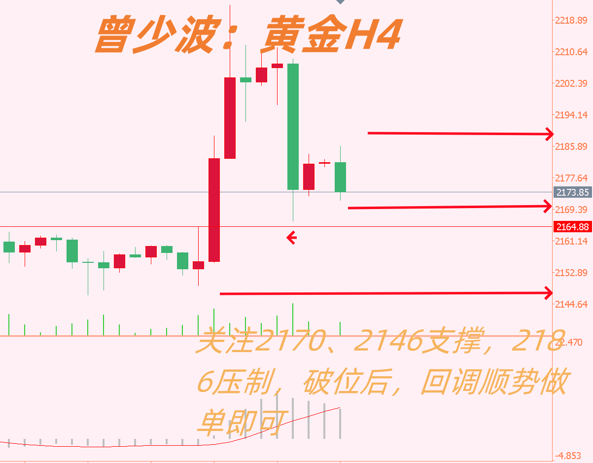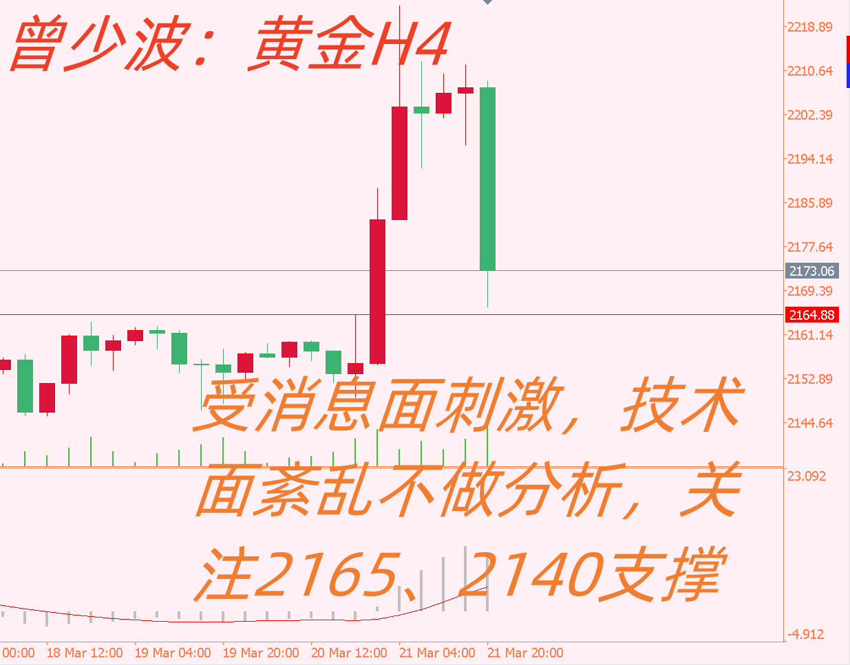 曾少波:3.22午评,黄金下跳上窜,多空趋势未定 投资朋友们下午好,昨日金价迎来过山车式波动,从最高2212,跳崖式跌倒2166,随后攀升至2184附近,至今日中午,再度回调至2172附近。 这种行情,市场上很多自信的投资者肯定有不少被套,可以联系曾少波帮你分析解决办法。目前2170关键点位,多次试探,未得到突破,多空还未定,保守的朋友可以选择暂时性观望。 技术分析: 从目前来看,黄金我们上方关注2184-2186一线压制,下方我们关注2166-70一线短期支撑,操作上我们先以区间对待,耐心等待调整充分后进场即可,具体操作策略我会在盘中提示,及时关注。 黄金操作策略: 1、黄金破位2170后