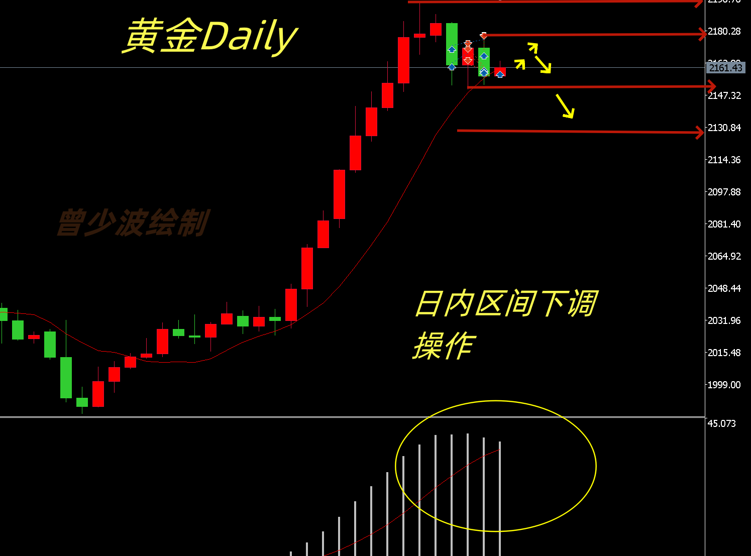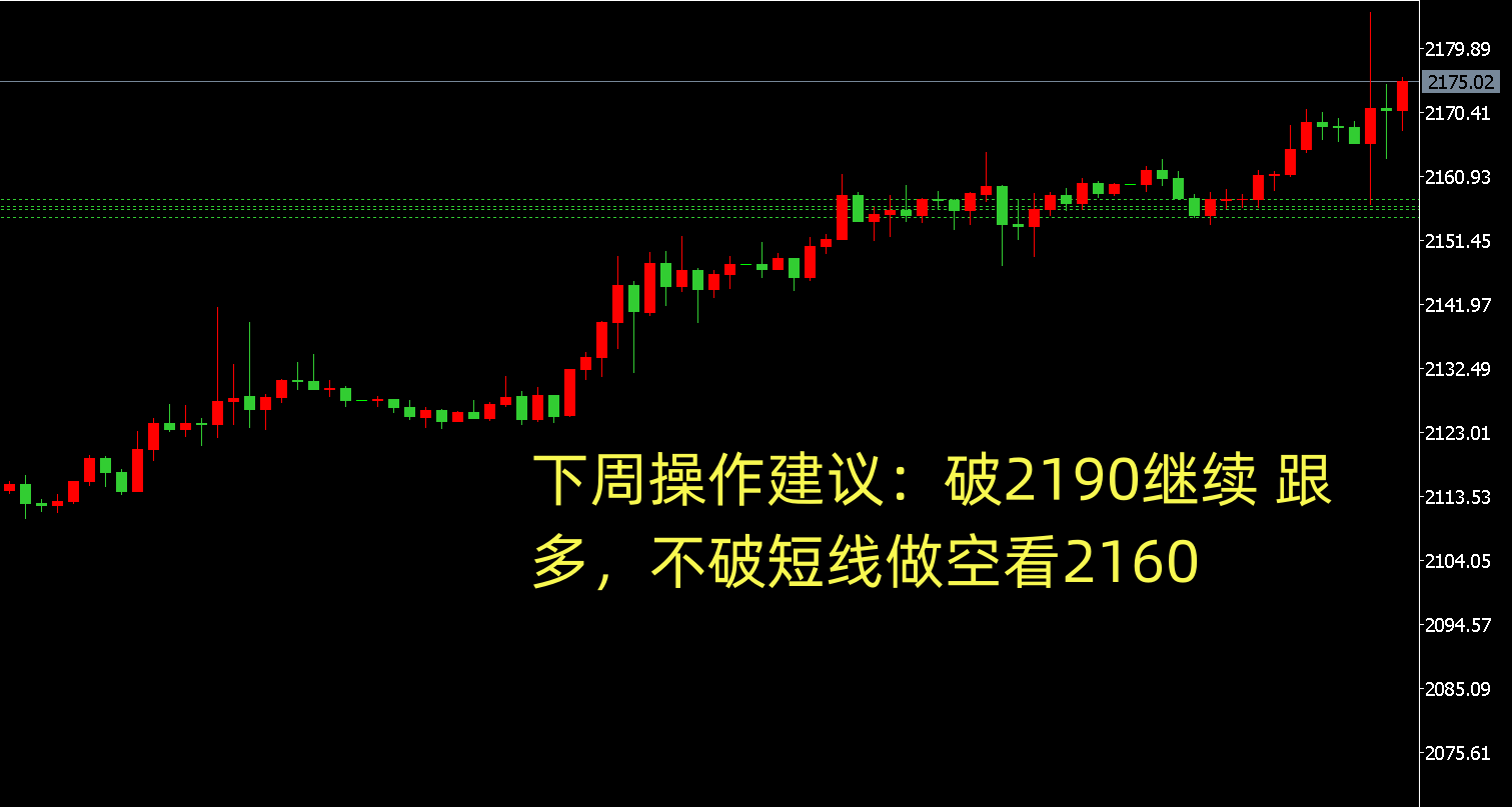 给自己一个微笑,种下一天的阳光!人生,每一份坚持都是成功的累积,只要相信自己,总会遇到惊喜!每一种生活都有各自的轨迹,记得肯定自己,不要轻言放弃!每一个清晨都是希望的开始,记得鼓励自己,展现自信的魅力,人生的顶峰一定有我! 本周回顾: 黄金在2023年12月4日刷新历史新高后,进入了短期的时间横盘震荡,回踩确定1973的支撑,再度找2088,再回踩确定1984的支撑,然后开启了这一轮全新的多头攻击,而最终的加速是从3月份开始,短短四个交易日的时间,黄金多头接连刷新历史新高,当前价格持续高位横盘2170关口区域 下周操作建议: 多头破2190仍可追多,不破短线踩空,看2160 曾少波——专注黄