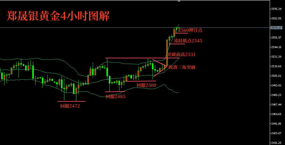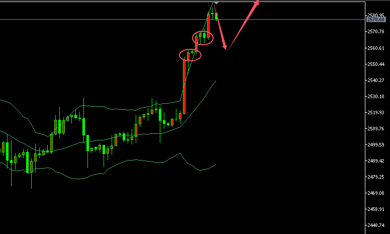没有清醒的判断,再好的行情也会踏空,没有谨慎的分析,再弱的震荡也会失手。我只想把我的肺腑之言告诉各位投资朋友,选择大于努力!一个人能走多远,要看他有谁同行;一个人有多优秀,要看他有谁指点;一个人有多成功,要看他有谁相伴。如果你在投资路上彷徨,不要在犹豫不决,借力使力才是王道! 黄金分析: 周四,黄金走势“波浪汹涌”;但是约在预期之中!一方面是趋势多头,另外不管是小时线还是4小时线连续性拉升后看回撤的力度以及时间方面的配合,凌晨金价最低回撤2545附近,随后小时线继续上攻到2560一线,也就是说凌晨还在不断刷新历史新高,没什么回调空间,形态比较强势。连回撤的空间都不给余地,说明多头