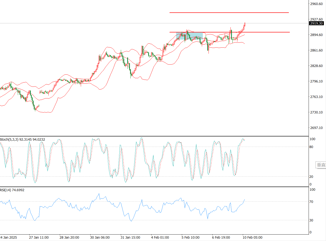 金价因特朗普政策不确定性,持续引发避险买盘,一度突破了2900整数关,是锐不可挡,还是短期最后的加速? 值得留意的是,短期所有金价的利好都汇聚到了一起,连此前在高位的美债收益率也来加持。在最新公布的美国服务业活动衡量指标弱于市场预期后,利率期货市场开始定价今年降息2次,而不是此前预期的2025年不降息,在降息预期推动下,各期限的美债收益率日内下跌至少10个基点。加之、美国财政部预计未来几季内将维持其大部分发债计划不变,10年期美债收益率重新回到了4.5%下方,这对于美股、黄金来说都是一个好消息。 金价在众多利好的加持下,承接此前的趋势惯性,一度突破了2900整数关,