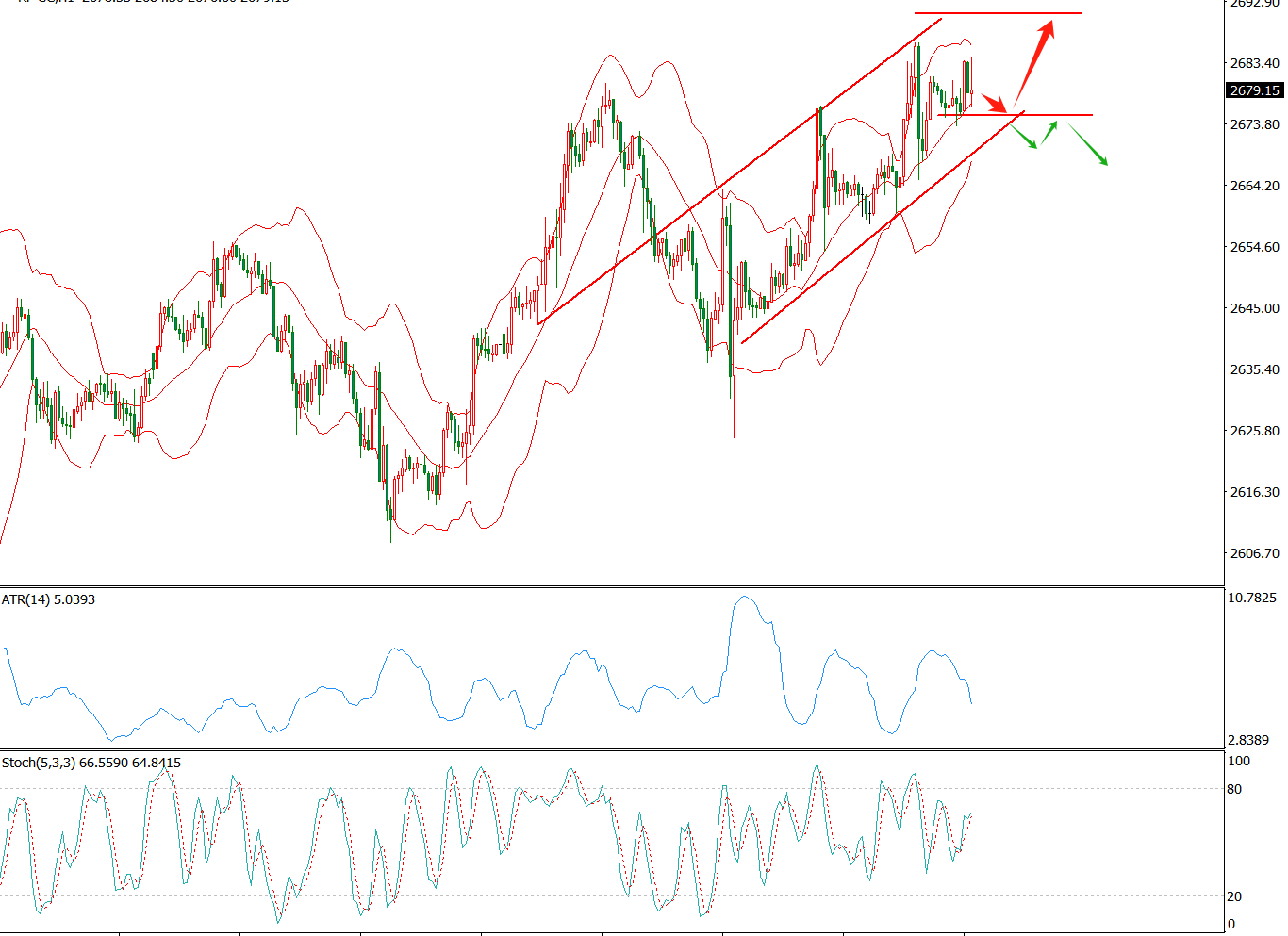 黄金短期新高,显强势 隔夜 ADP 就业数据不及预期,让市场对接下来的非农也产生了遐想。金价震荡后短期选择了向上突破。突破前高后就形成了上升通道。 KDJ 指标拒绝回落,说明小时图趋势偏强,每次回落不深就被拉起,从趋势看短期或仍有震荡向上的概率。只是非农数据当前,市场波幅或受限。 上方阻力暂看 2691 附近,下方支撑在通道时空运行的下轨 2675 附近。 2675 撑住的话,趋势维持上升;若是被下破之后回弹收不回,则可能持续回落了。这应该是短期金价的跟随和应对之策。 A 股或仍需二次探底。 周三 A 股直接深 V ,貌似止跌,但我们提示了,仍未摆脱震荡。 今天看走势,还是没有脱离中枢,还是