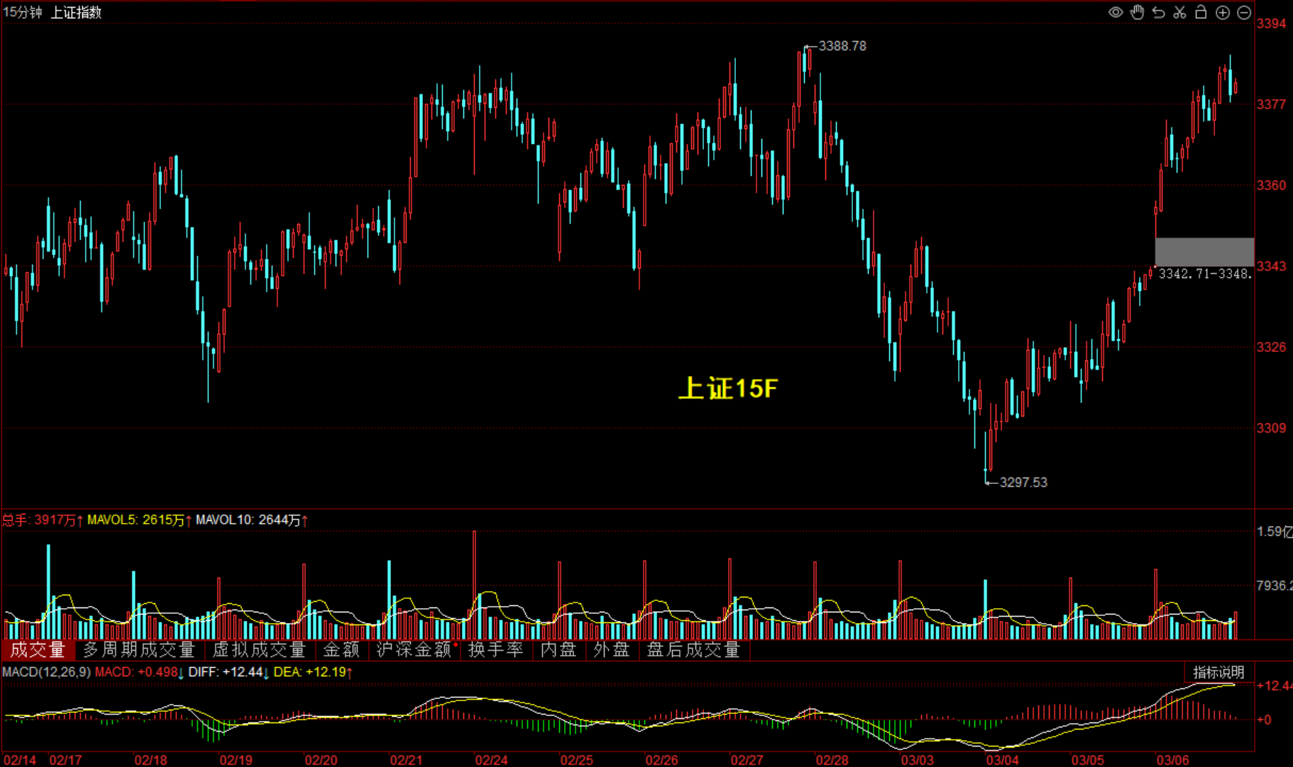 今日指数延续了昨日的升势,沪指再收中阳线,站稳3300点上方之后靠近3350,且收复了20日线,波段又回到了多头趋势中。虽然成交量不及前一段高位时期,但较昨日有所放大。个股方面跌多涨少,但涨跌停家数比70:6,还是显示市场情绪回暖。 值得留意的是,指数是顶着外盘下跌和地缘的博弈风险的情况下持续反弹,因此相对强弱来看,算是强势的表现。如今站上20日线,后续有望收复3350预计再次试探3400阻力。 明天可留意人形机器人、AI算力等主线对情绪的带动性,以及低位的地产,高股息等板块是否轮动上行。 沪指15分钟图在此前底背离后,MACD指数已经站上零轴,整体市