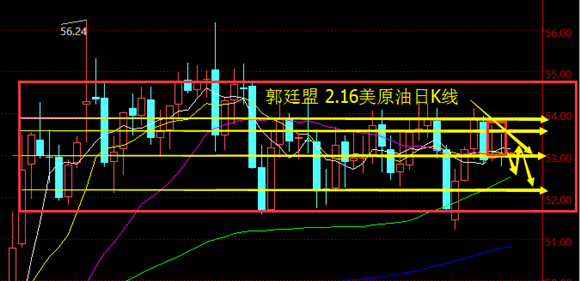 市场资讯:EIA之夜油价走势风险偏下行 周三(2月15日)亚市尾盘时段,国际原油价格震荡走低,目前美国WTI原油3月期货交投于52.87美元/桶附近,跌幅约0.6%,布伦特原油4月期货目前交投于55.67美元/桶,凌晨出炉的API大增令油价走势持续承压,同时美元多头再次复苏进一步的施压油价。 隔日油价又一次的冲高回落,日线图的技术面