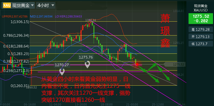 隔夜国际现货黄金遭受连续打击,金价一举下破1270一线支撑,最低触及1265.8一线,黄金弱势局面凸显无疑。昨日现货黄金开盘于1277.5美元一线,早间金价短线反弹至1282美元一线后受阻回落,金价亚盘和欧盘时段震荡下行,临近美盘欧洲央行行长的鸽派发言打压欧元主推美指上扬,美指一举上破94关口,金价再次承压下滑,晚间美盘